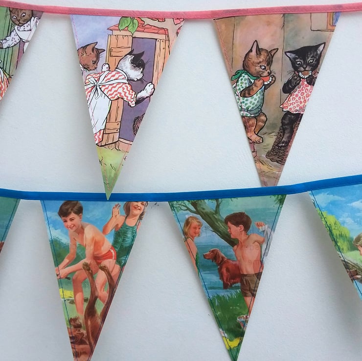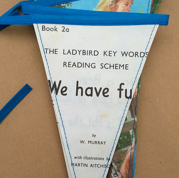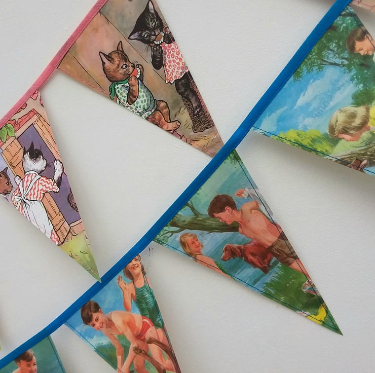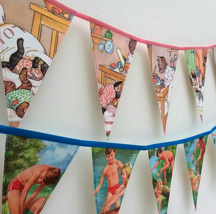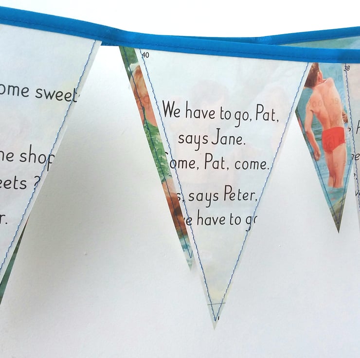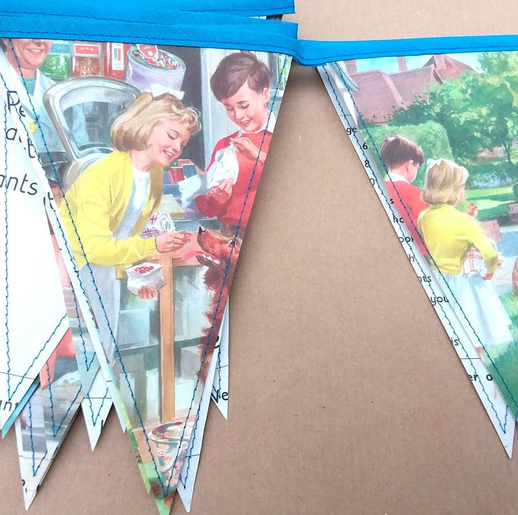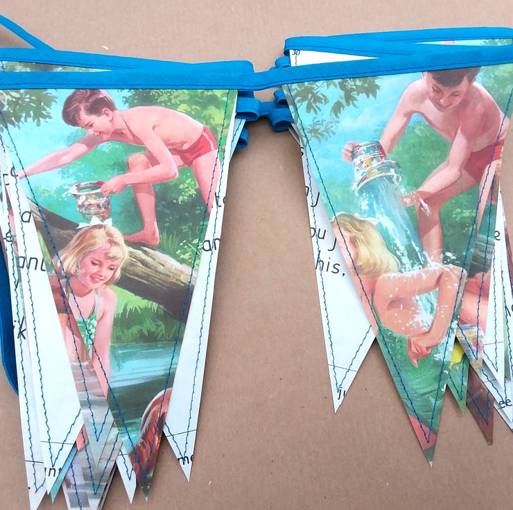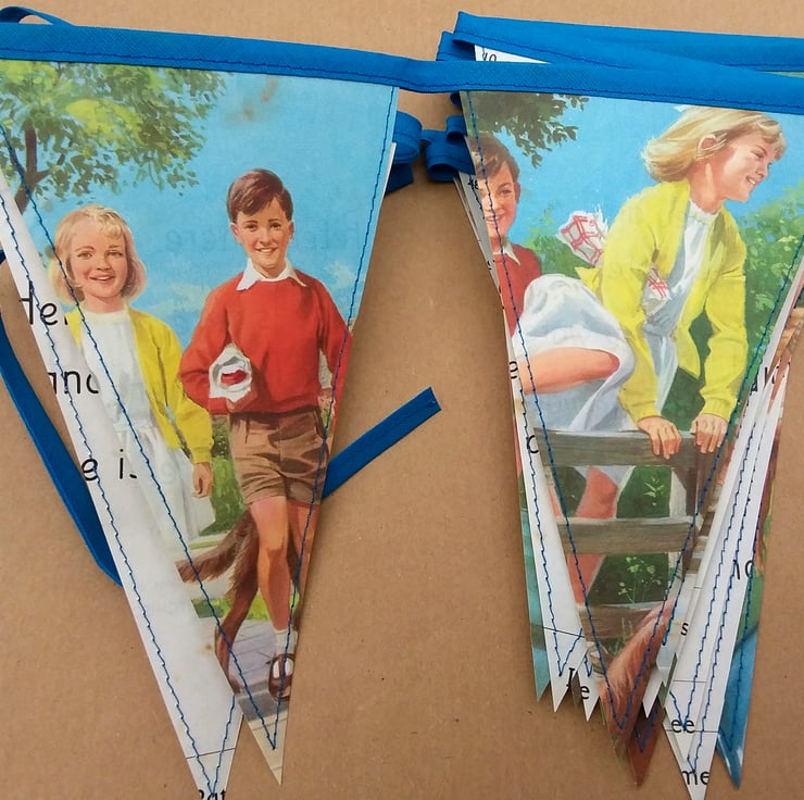 A long length of paper bunting made from a vintage Pater and Jane book - 'We Have Fun'.
