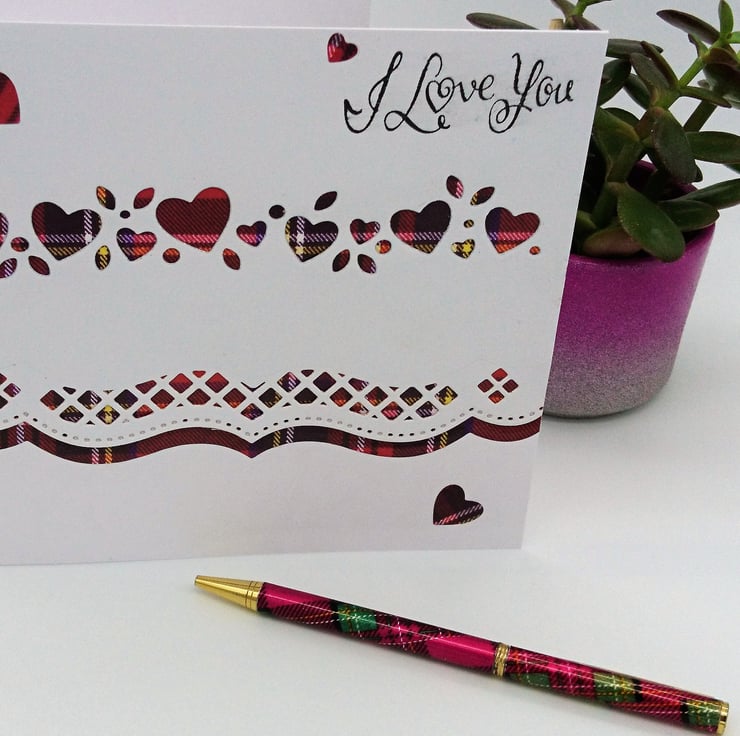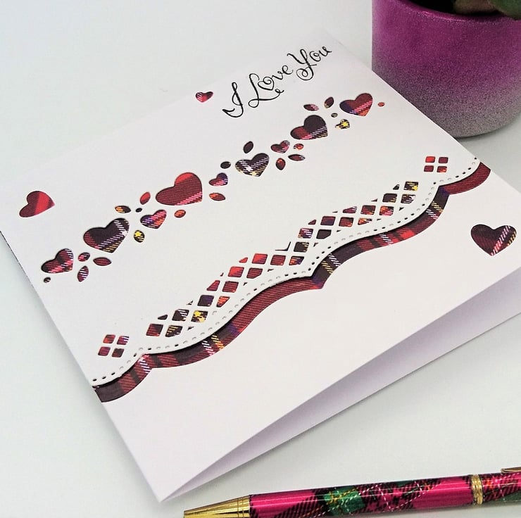DETAILS: Top Quality White Card, layered with, tartan, topped with die cut white card of heart and fancy lattice border, complete with "I Love You" sentiment.