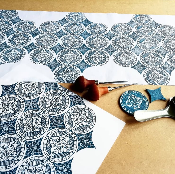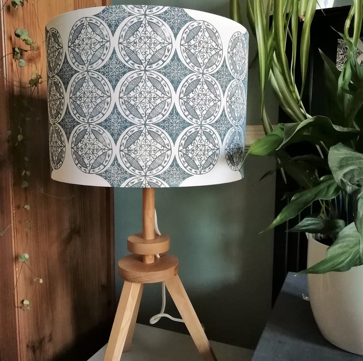 This is a hand block printed drum lampshade. Printed using hand carved stamps.