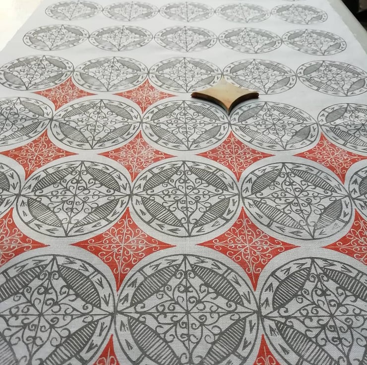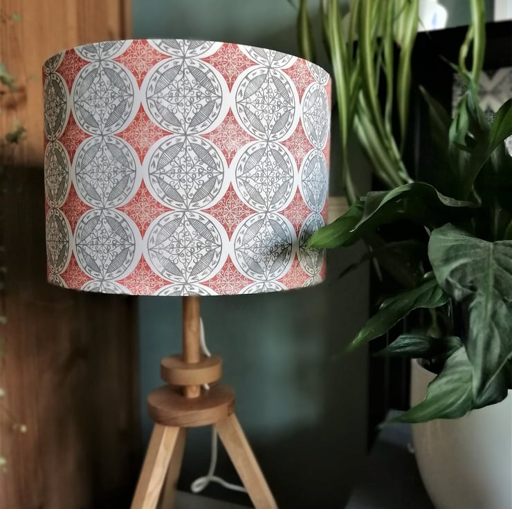 The fabric of this lampshade has been hand block printed using hand carved stamps.