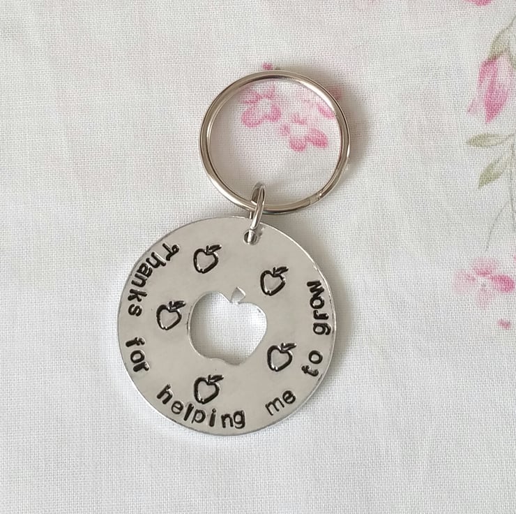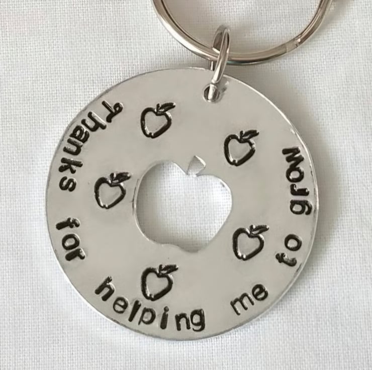 Hand-stamped gift, stamped with 'Thanks for helping me to grow' on a 30mm disc that has an Apple cut out in the middle.