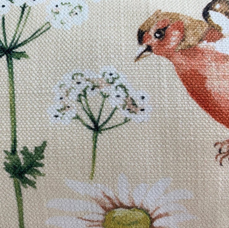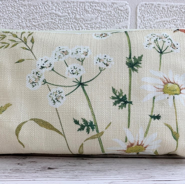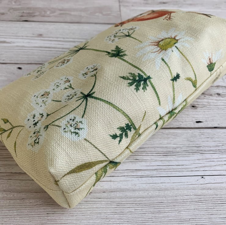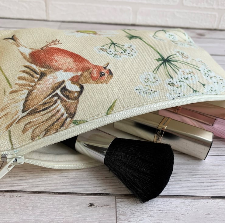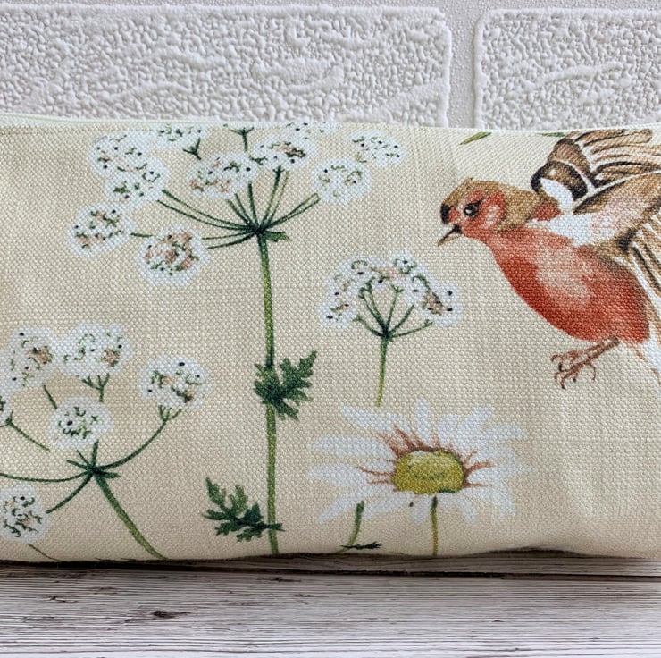 A handy make up bag or pencil case in cream fabric with a lovely bird print. The pattern features a brown and red chaffinch flying amongst cow parsley and daisies in shades of green, white and golden yellow. The cosmetic bag has a cream zip and is lined with cream fabric. The bag has a boxed base to give extra space inside.