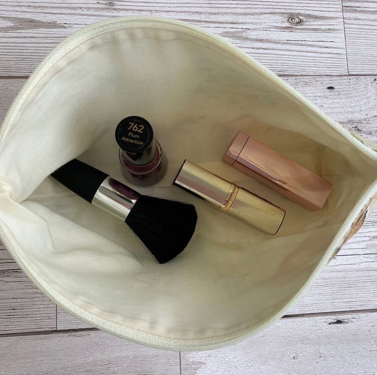 The approximate measurements of the make up bag are: 10" (25cm) wide x 5" (13cm) high x 2" (5cm) across the base.
