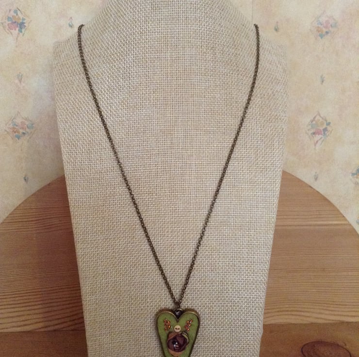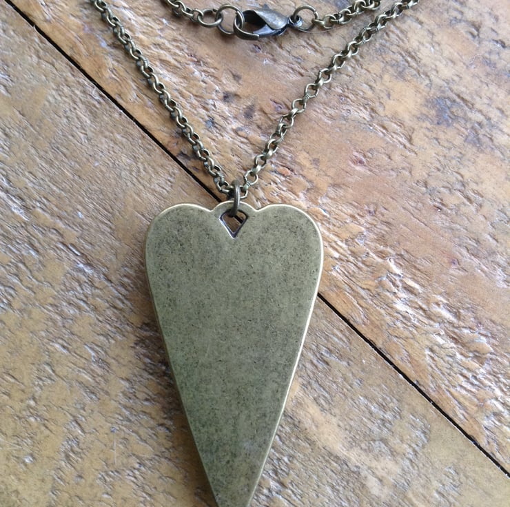 The bronze heart measures 5cmx3cm, and the chain is 75cm long.