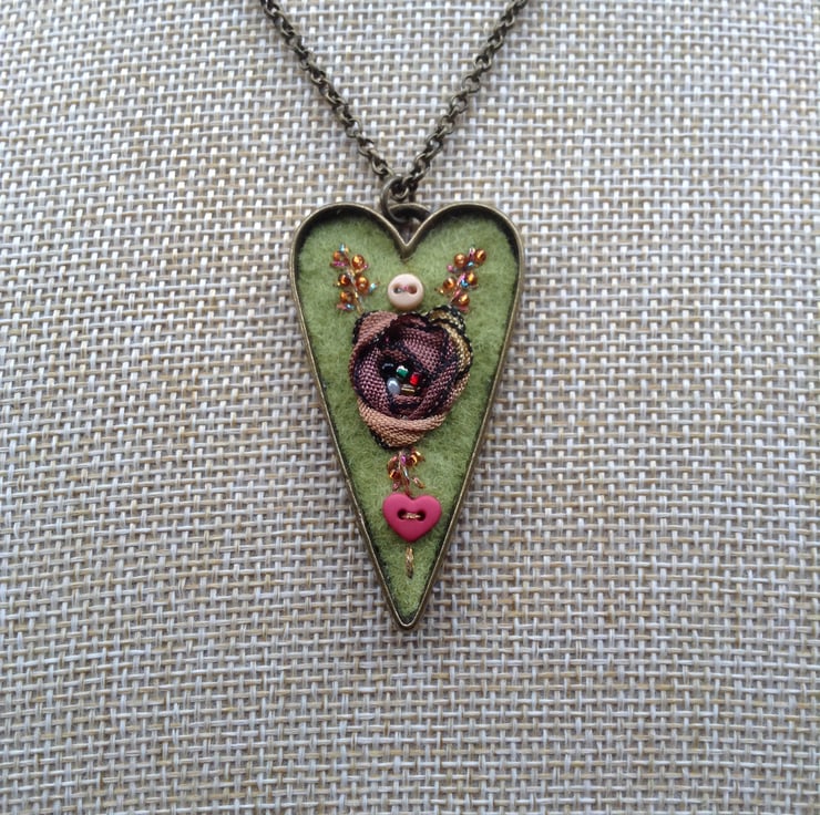 I have embroidered the 100% wool felt base with a silk ribbon rose with glass seed beads in the centre. The leaves are embroidered with beautiful variegated metallic threads which contrasts with the matte felt background, and tiny glass seed beads. The tiny buttons represent berries.