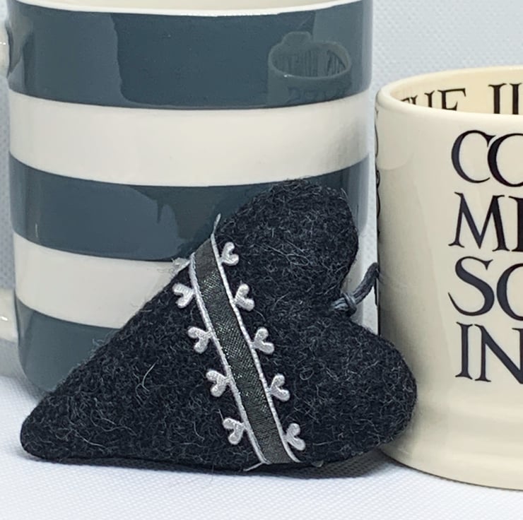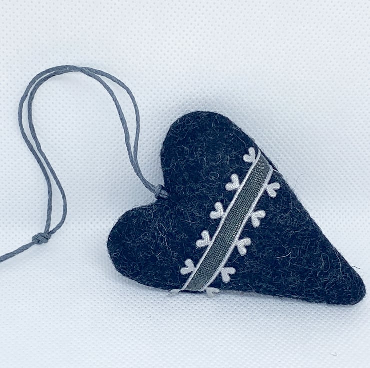 Handmade in my garden studio, the beautifully-shaped hearts are made of dark charcoal grey 100% merino wool felt. Generously filled with gloriously fragrant locally grown Hampshire lavender, the hearts are finished with a delicate pale grey chiffon ribbon trimmed with tiny love hearts and a grey hemp twine loop.