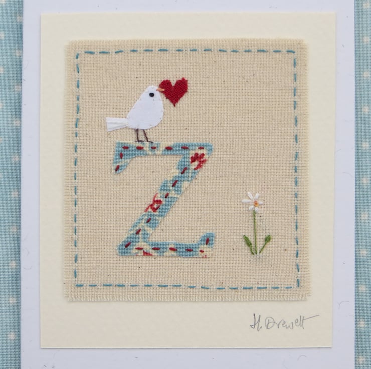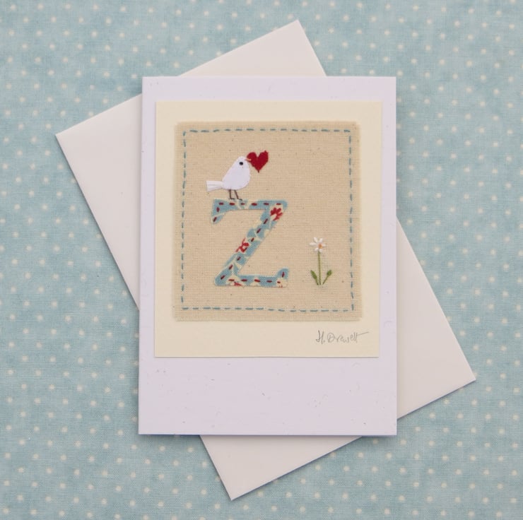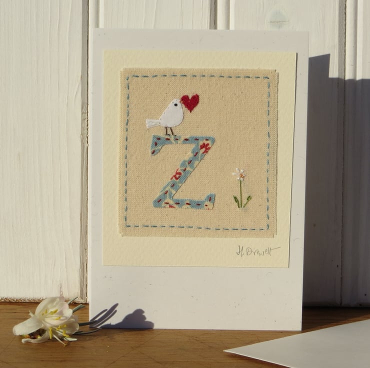 A hand-stitched card with the letter 'Z' cut from pretty cotton fabric stitched into place with tiny stitches. I have added a miniature applique dove with heart in her beak, and then embroidered a tiny daisy flower to complete the design.