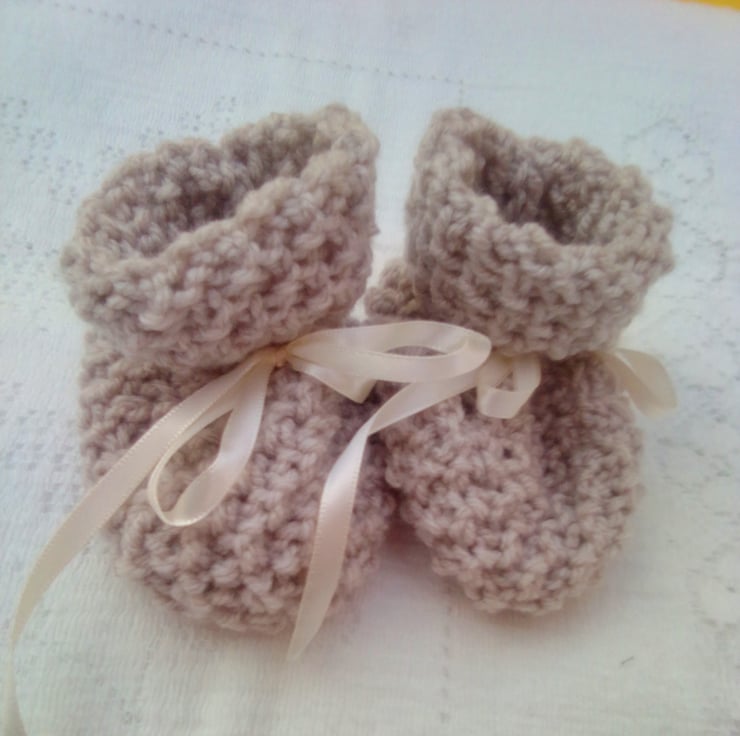 The set comprises a pair of bootees and mittens for baby. The set is not currently in stock but it can be made for you in a colour of your choice, please state colour required when you order. Please allow 1 - 2 weeks processing time to produce and post to you.