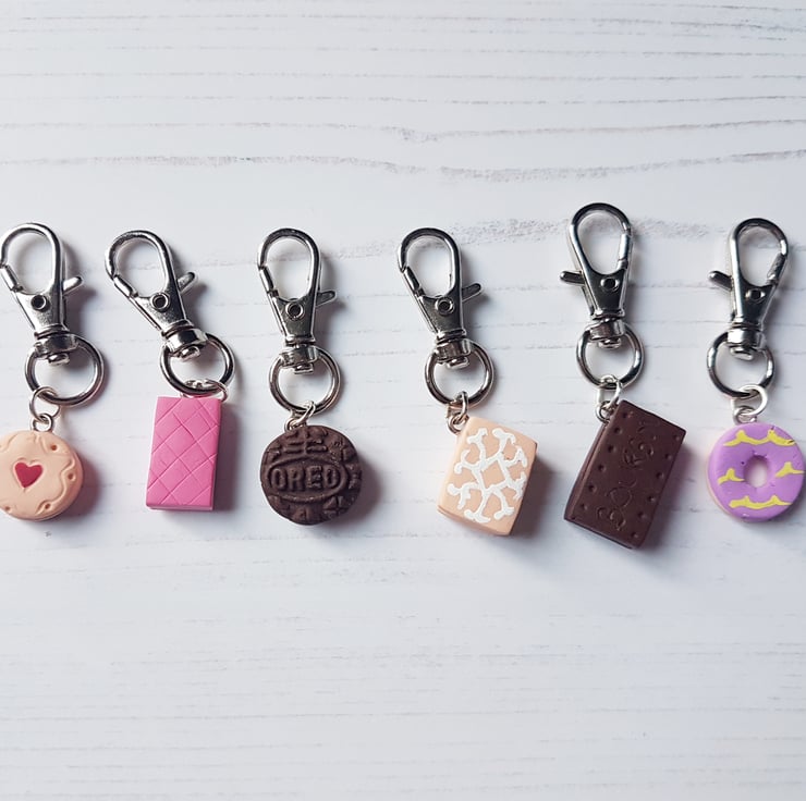 Handmade mini versions of your favourite teatime Biscuit treats, each attached to a lobster clasp, to use either as a planner charm or as a stitch marker for knitting and crochet!