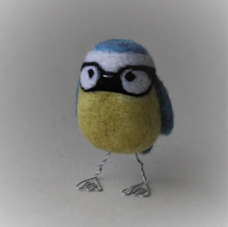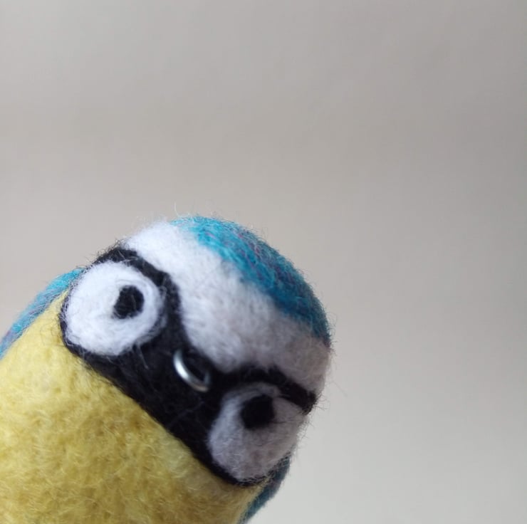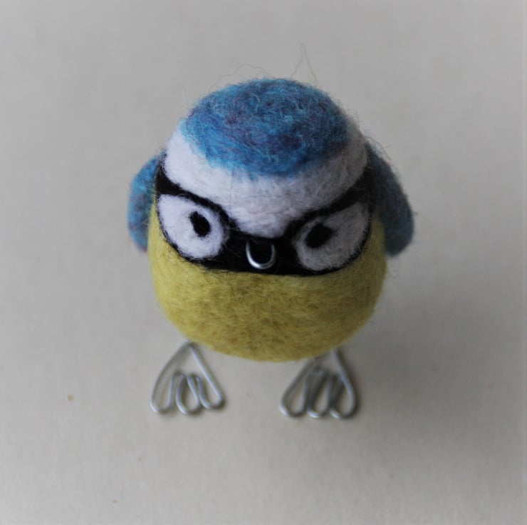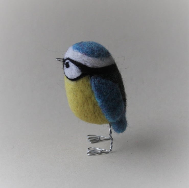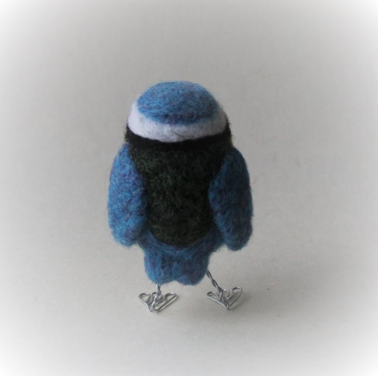 Freestanding wire and wool blue tit sculpture measuring approximately 7.5 cm tall.