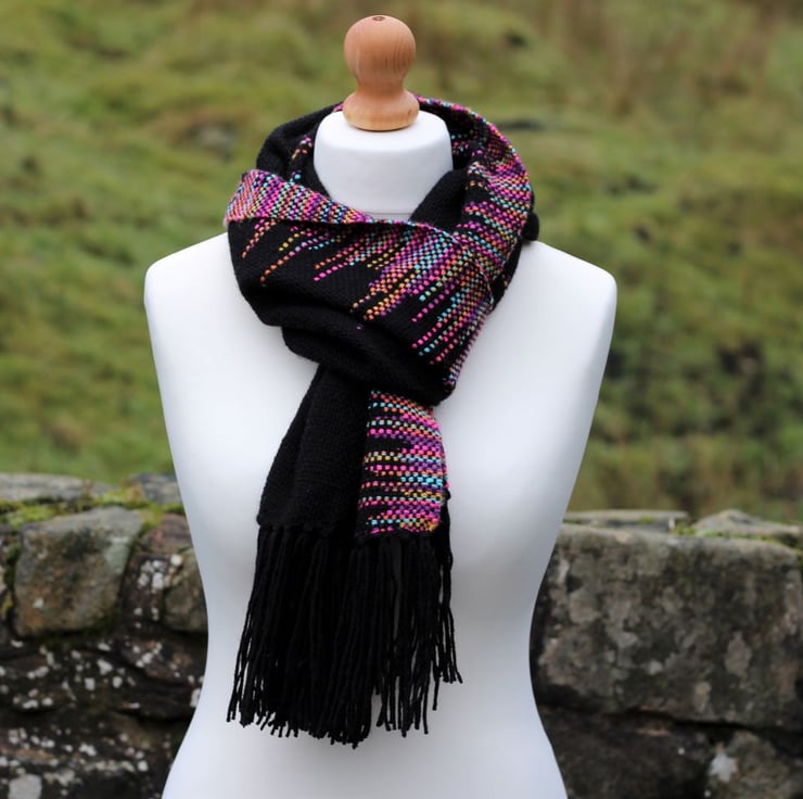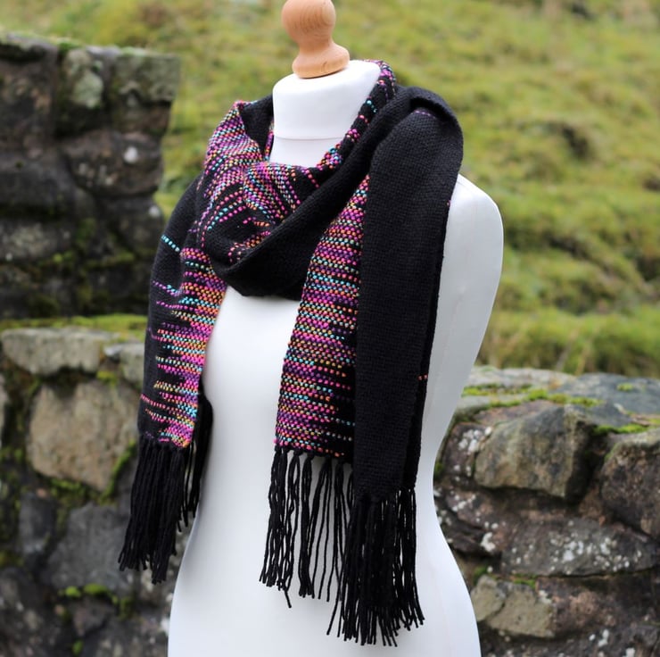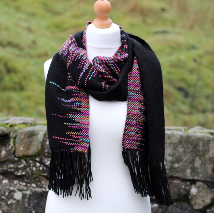 This scarf has been hand woven to create a striking pattern of both black and multi-colours and can be worn in a variety of ways.