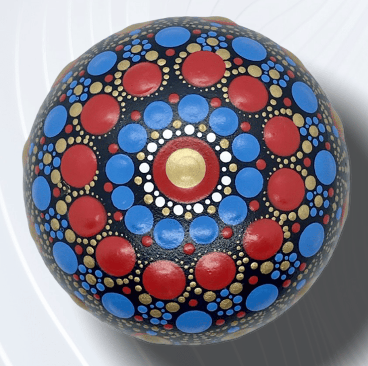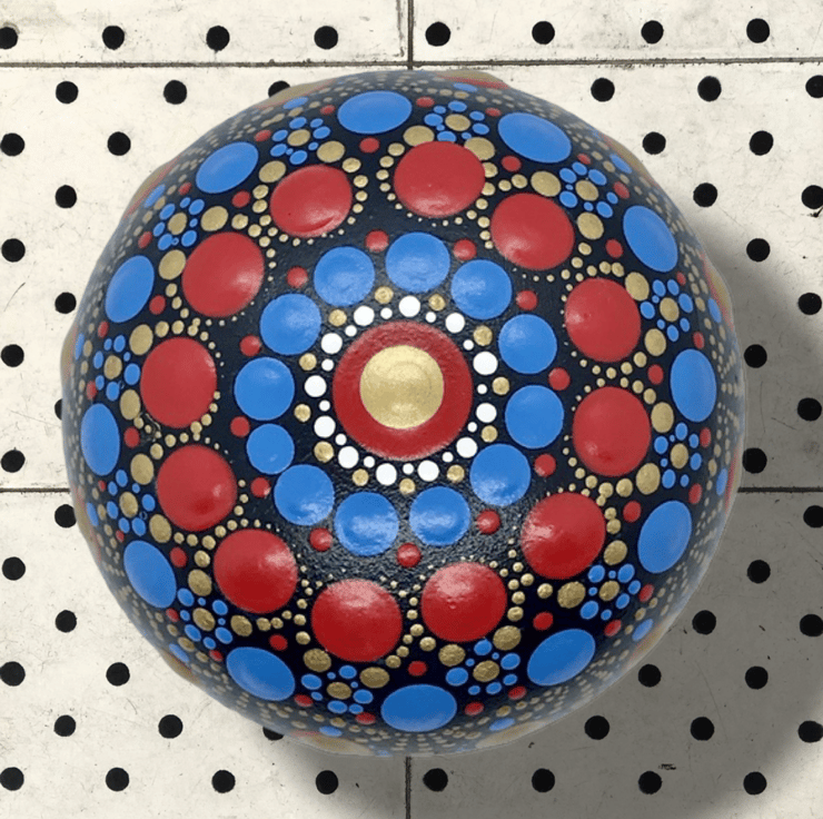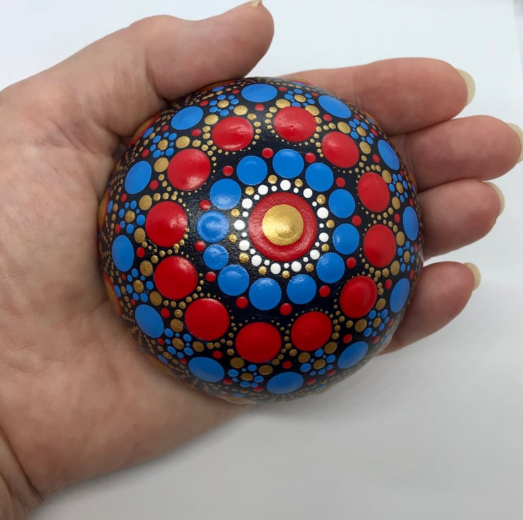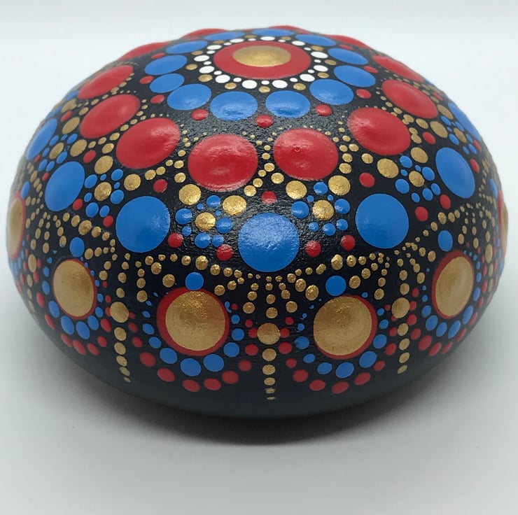 Painted in acrylics and varnished in a subtle satin sheen, this ‘stone’ measures approximately 14cm across and is 5cm high, and it weighs 260g. The colours are red, blue and gold.