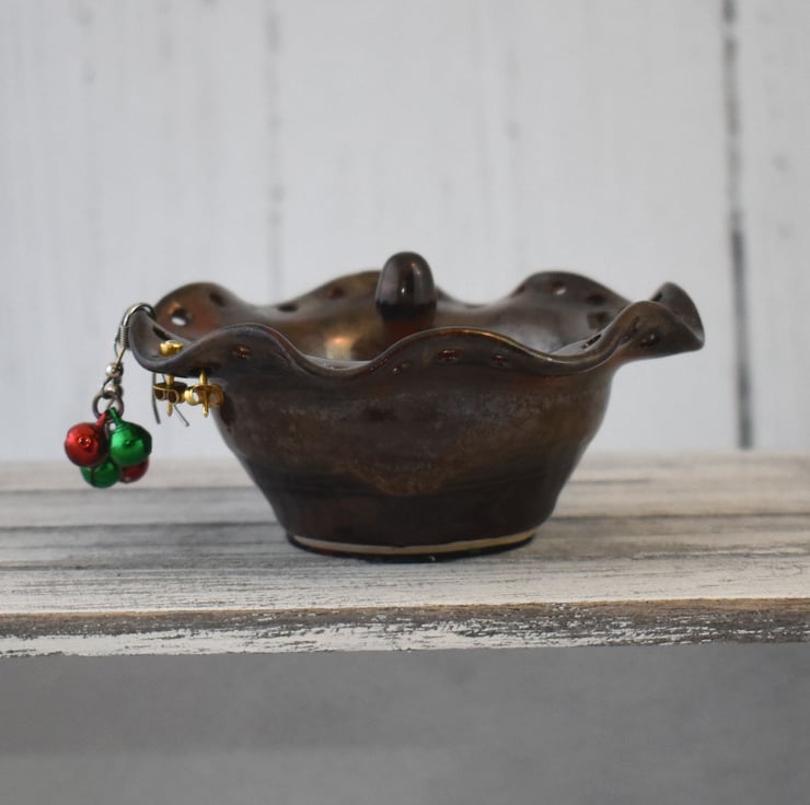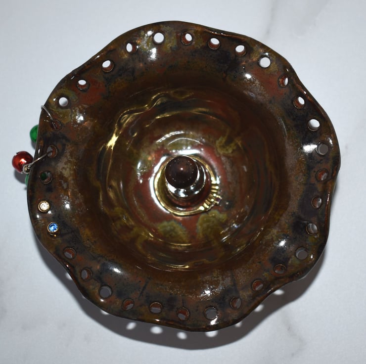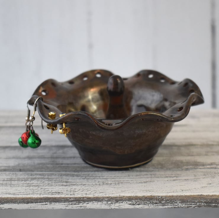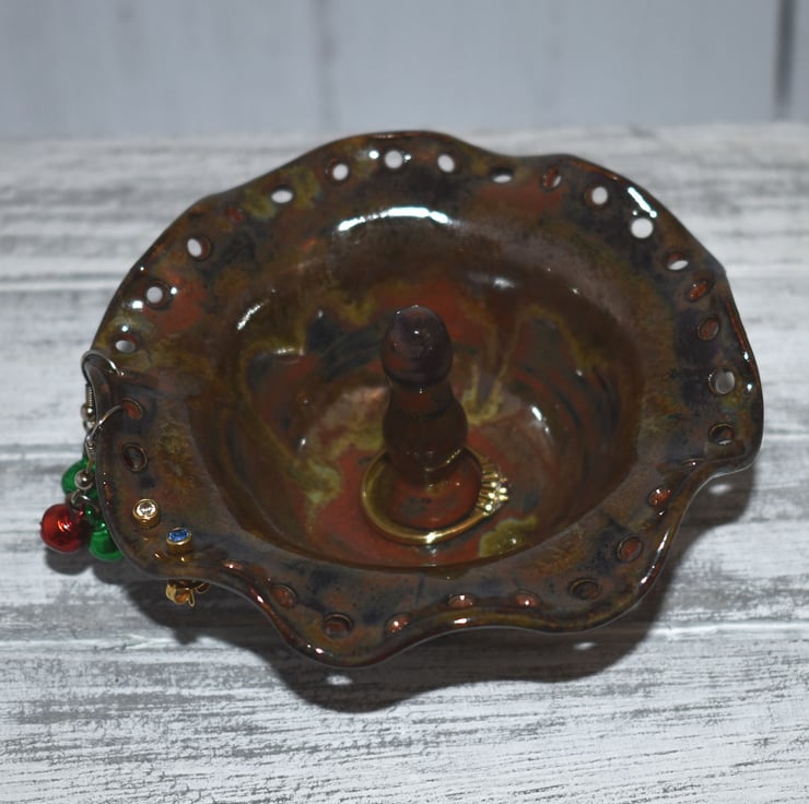 Hand thrown dish with holes around the edge for ear rings and a spike in the centre for rings, standing 5cm high and 10cm diameter. (Jewellery not included)
