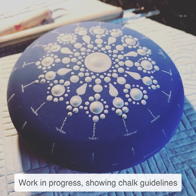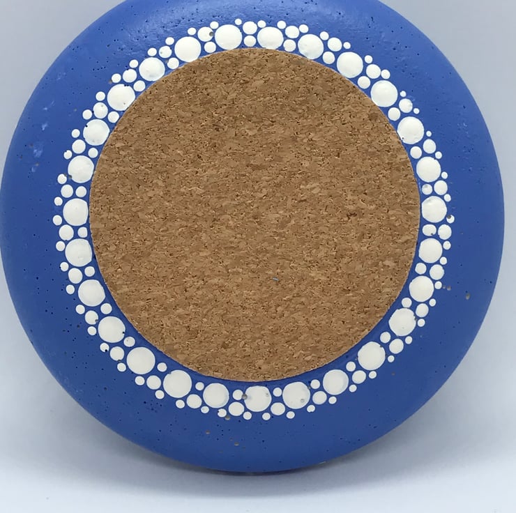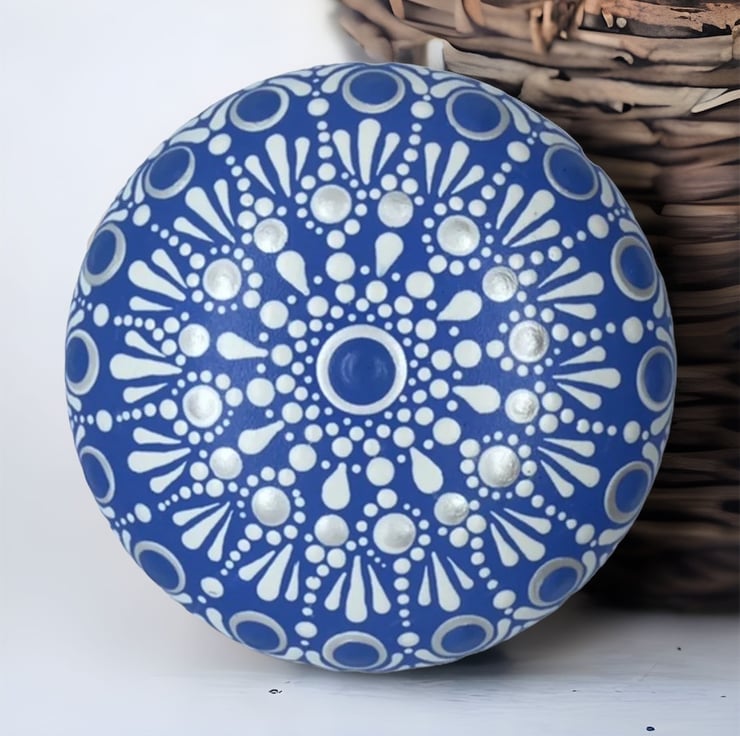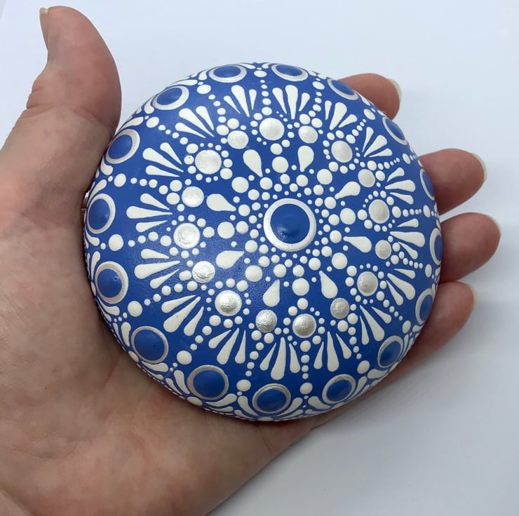 Made from robust plaster, and carefully hand painted in acrylics, this pretty stone has been decorated with a mandala pattern in pearl paint, and finished with a satin varnish, making it silky smooth to touch. It measures 12cm across and is approximately 3cm high and weighs 290g. A cork disc has been applied to the reverse, to protect your furniture.