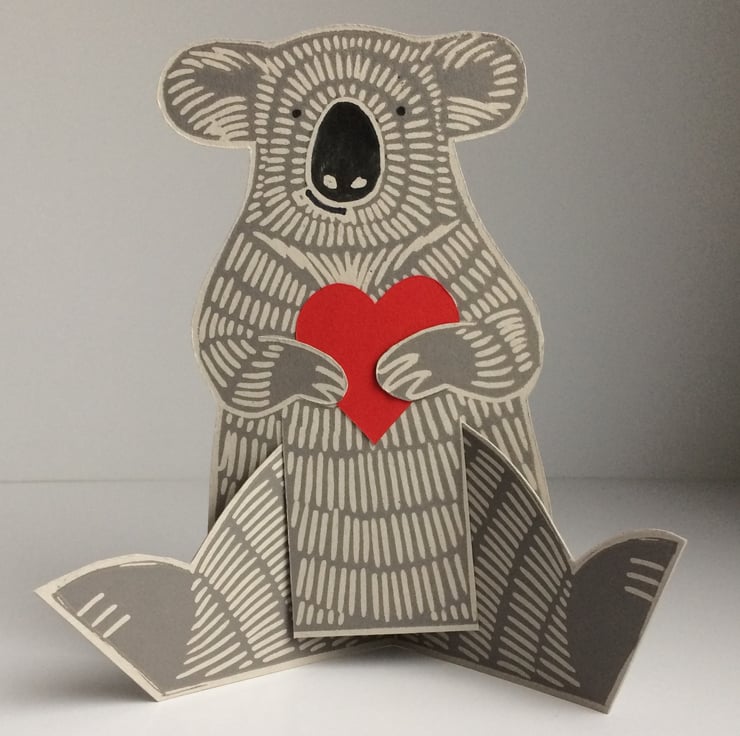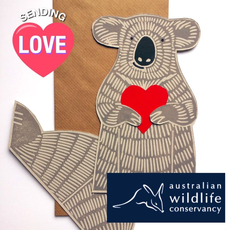 G’day Folksy shoppers! Please let me introduce my original 3D Koala card, the perfect card to give and show you care this coming Valentine’s Day. I designed this especially to raise money for the Australian Wildlife Conservancy whose award-winning EcoFire program lost its government funding at the end of 2019. £5 from each card sold will go to the charity to continue its good work. The koala is approximately 20cm x 10cm and is printed on a vintage press using my original linocut on to buff coloured recycled card. He is then hand cut and a sweet little red heart enclosed within his paws. Simply slot in his legs and sit him on a shelf or windowsill. He comes with a brown kraft envelope and will be posted out in time for Valentine’s Day. Give the gift of Antipodean Love this Valentine’s Day and feel proud to have contributed. I AM PRINTING MORE OF THESE FURRY LITTLE FELLAS THIS WEEK (3/2/20), PLEASE PRE-ORDER NOW!!