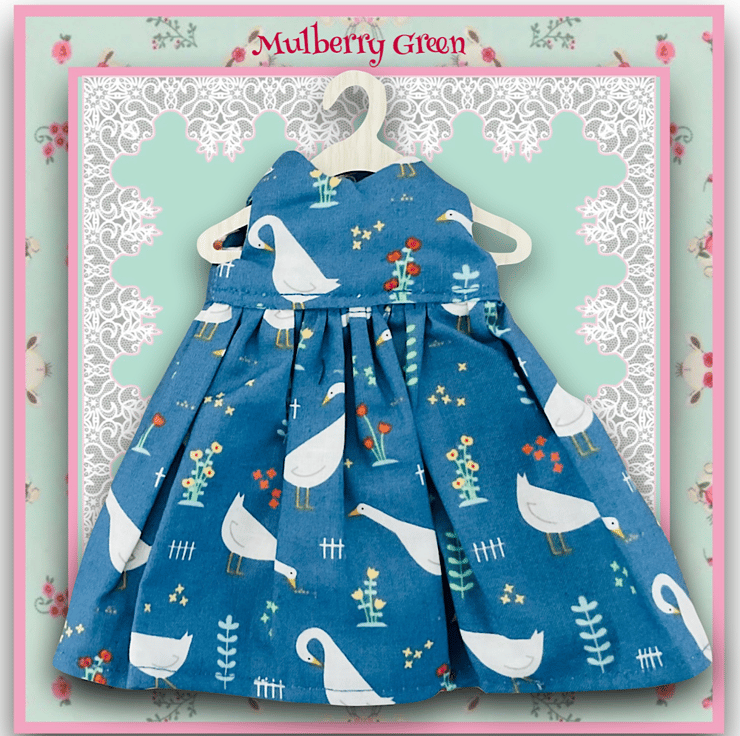 A sweet little blue dress in a pretty goose pattern to fit the Mulberry Green characters. The dress is made from best quality cotton, has a full skirt and a lined bodice.