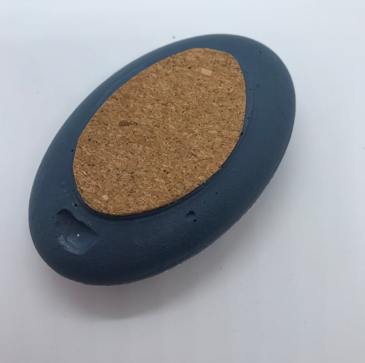 This is a little oval “stone” made of hard plaster, painted in acrylics with countless tiny dots. It measures about 10cm long, 7cm wide, and is 2cm high. It would work well as a simple paperweight and novelty gift.