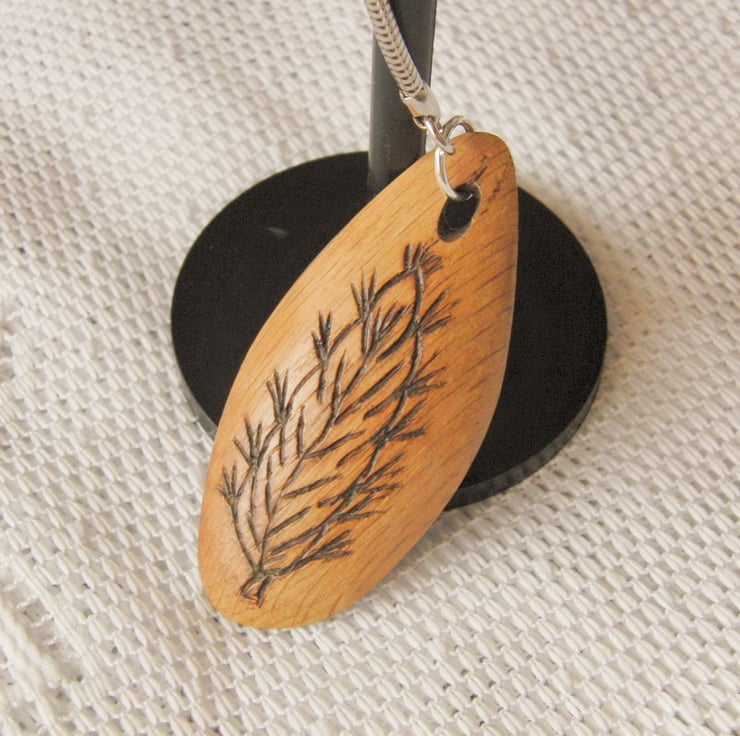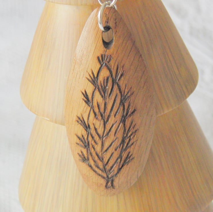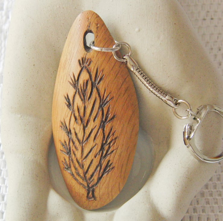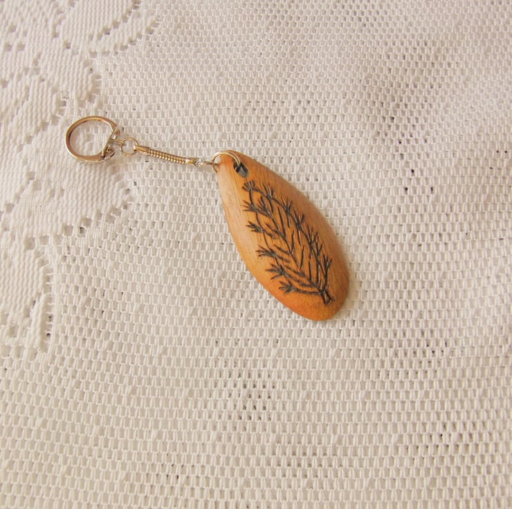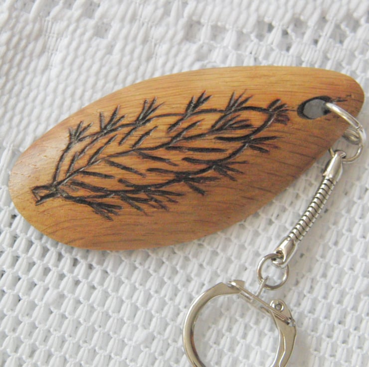 The keyring is silver plated and has a 7.5 cm x 3.5 cm brown leaf drop which is decorated with a black etched leaf pattern. The wooden leaf is hung on a silver plated snake chain and clasp.