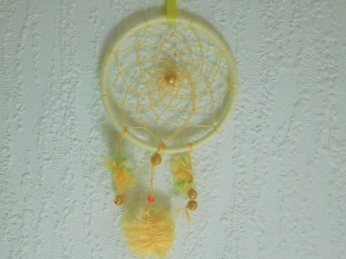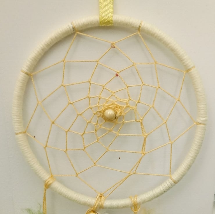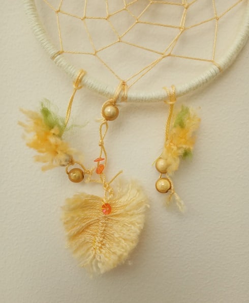 This small Dream Catcher is made with yellow cotton. It is embellished with beads and has hand made feather and wool tassels, to decorate. It would be lovely as a gift for a special occasion, or hung on a drawer or door handle, to give a bit of decoration.