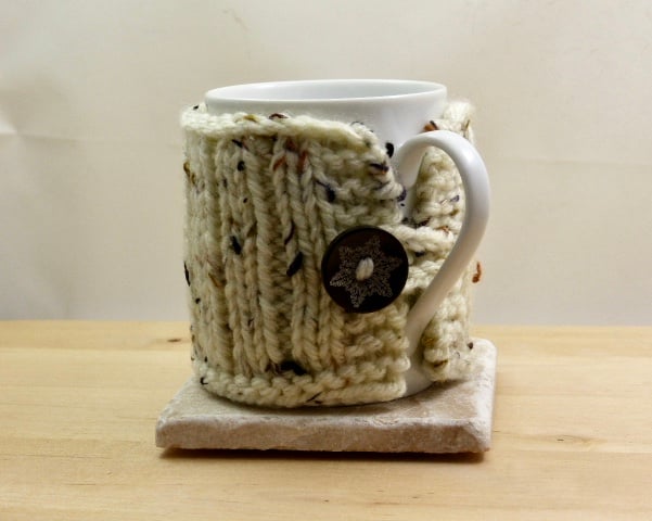 A hand knitted mug cosy in an acrylic natural yarn. It measures approximately 24cm long by 8cm but as I have knitted it in a rib pattern it has loads of stretch so should fit most standard mugs. Just wrap it around your mug and fasten with the crocheted loop and wooden snowflake button. This item will be sent by Royal Mail.