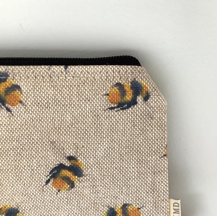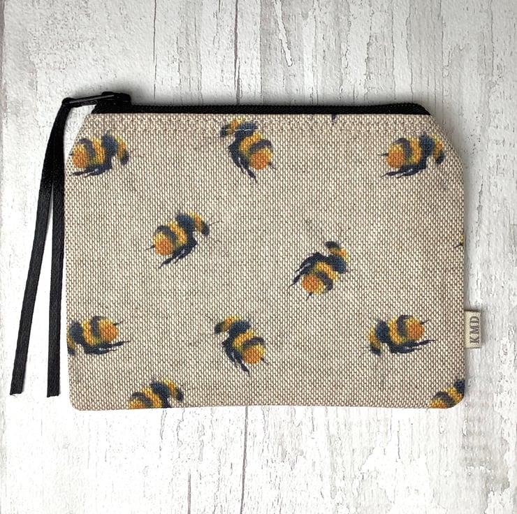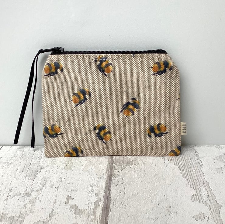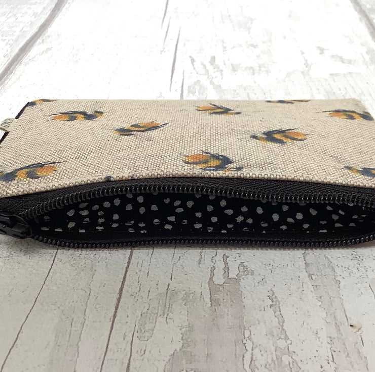 Pretty coin purse in a natural linen with a bee print. Lined in black spot cotton with a zip fastener. 12.5cm by 9.5cm.