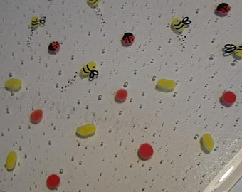 24cm Clear Base hand drawn bee's and Ladybirds randomly scattered over the surface.