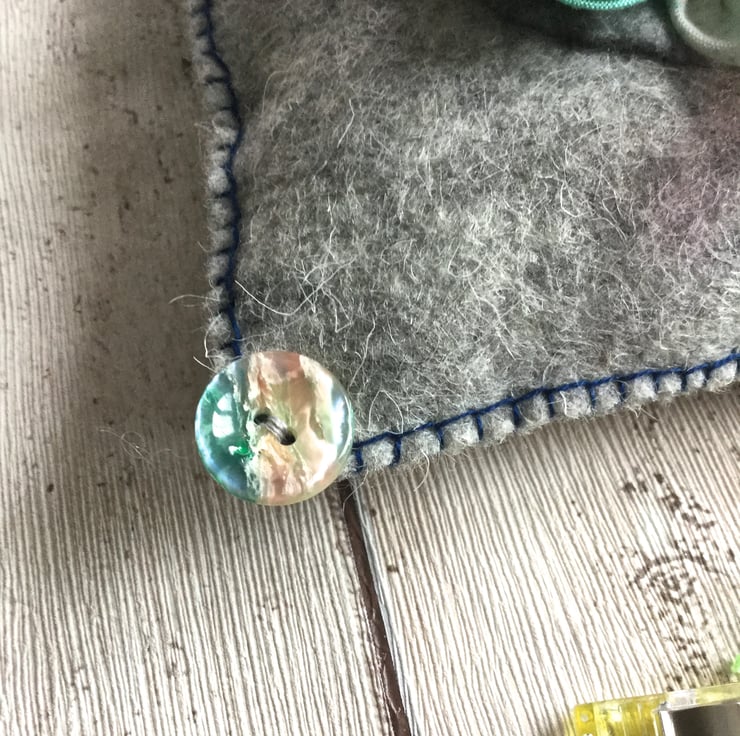The item is sewn together with a navy embroidery thread in a blanket stitch and each corner has been decorated with a button in shades of turquoise and pearl to compliment the colours in the flower.