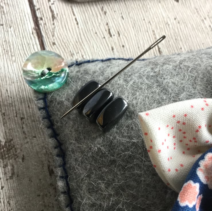 Three magnetic, black beads are sewn on one corner to hold a needle and the rest of the cushion can be used as a pin cushion. If placed at an angle, they will not pierce the bottom of the cushion and mark your surface.