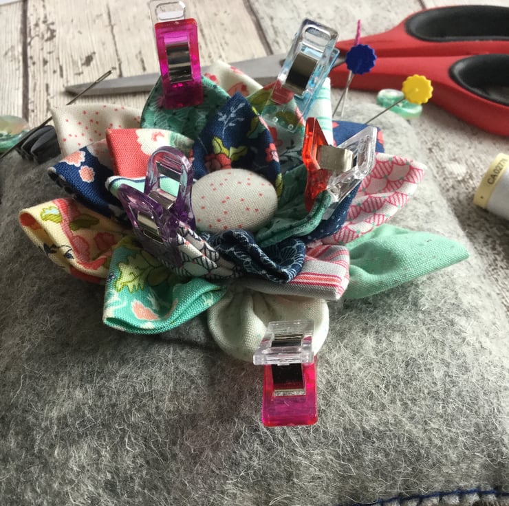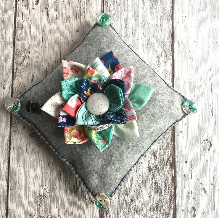 This pretty and very practical piece of sewing kit will keep all those pesky quilting clips, pins and a needle in one place. This item is completely hand stitched and the pillow or cushion is made from a grey wool felt, filled with polyester toy stuffing and some polypropylene granules to give weight and stop it moving around your table. The flower has 20 individually created petals in a cotton fabric in shades of navy, turquoise, pink, salmon and green and topped with a self covered button. Each petal will hold a quilting clip.
