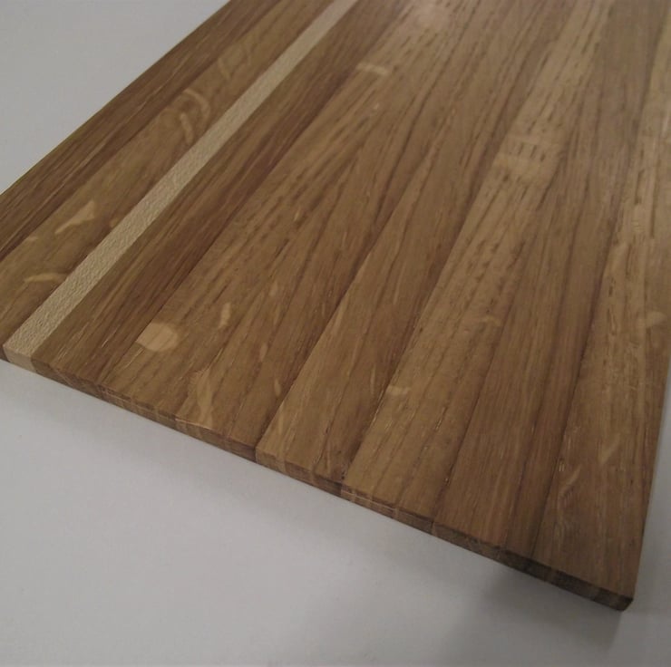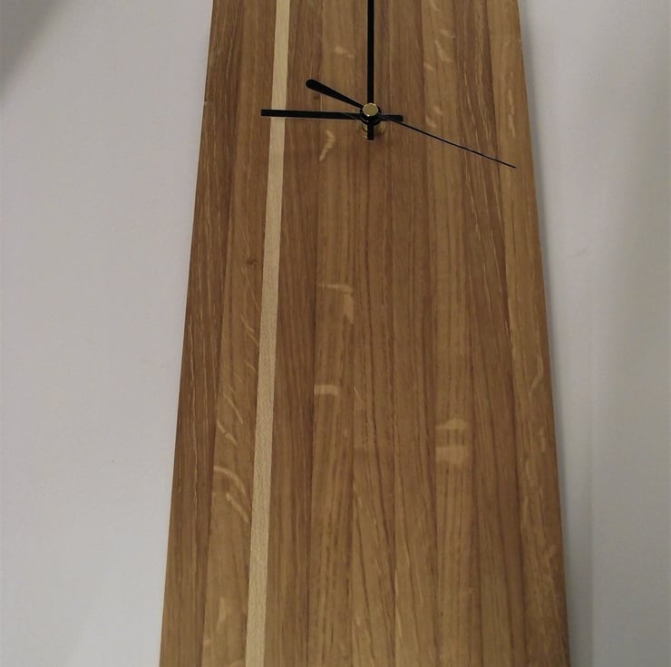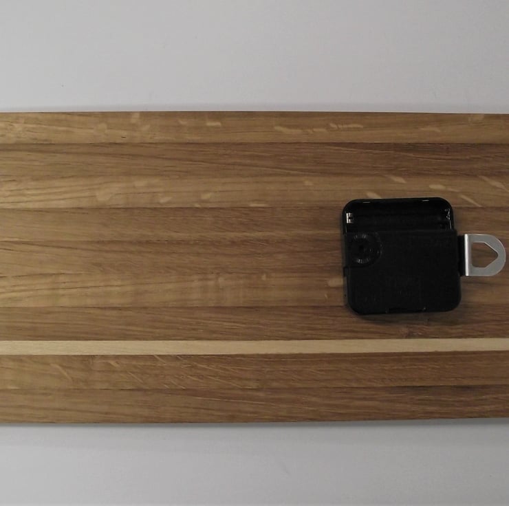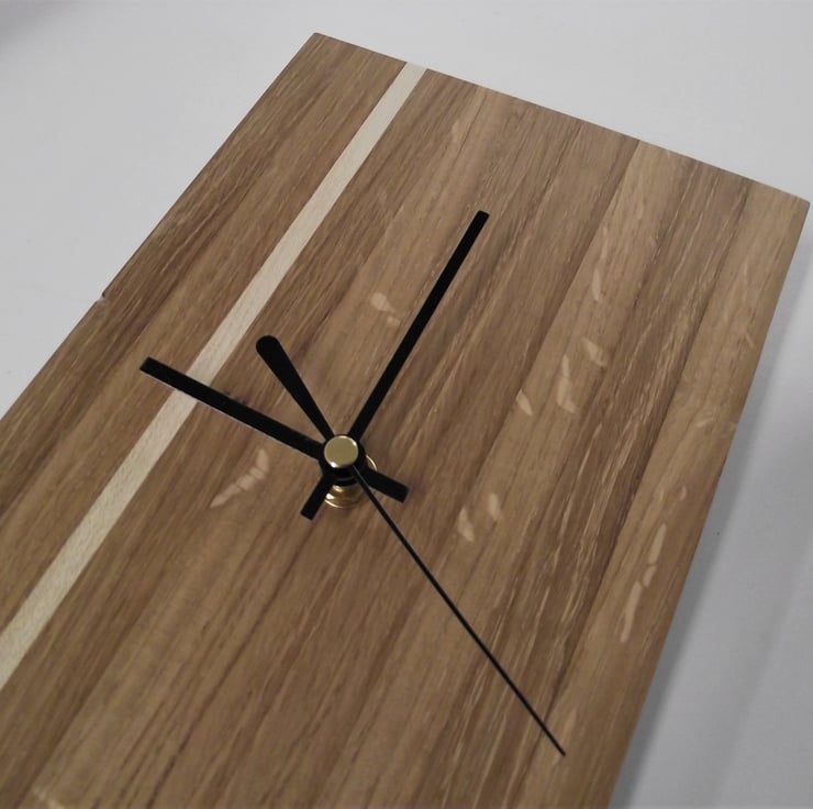 Oak and Holly clock, 382mm x 153mm x 5mm plus mechanism, finished in mineral oil. An Oak and Holly laminated clock face with a quartz movement and black metal hands. Made up of narrow strips of reclaimed timber.