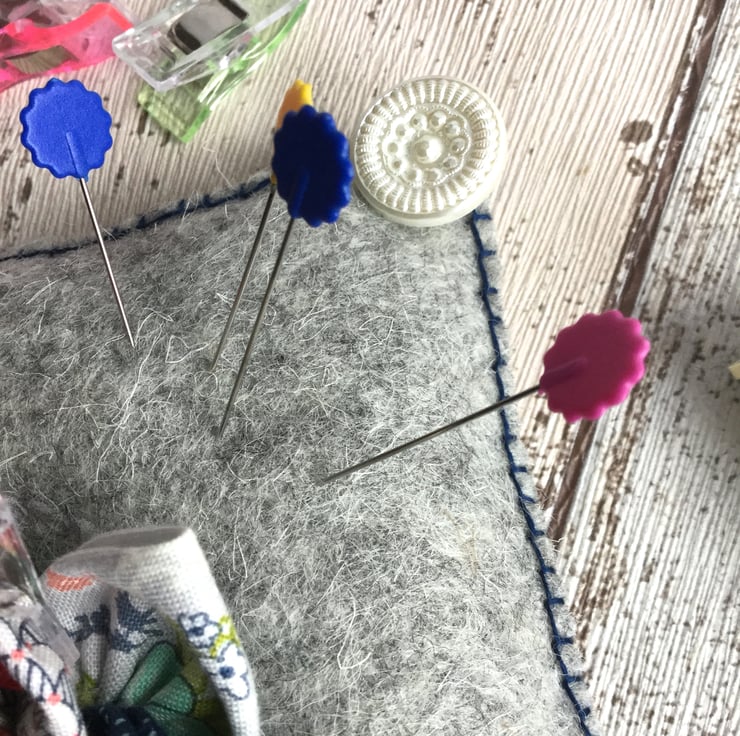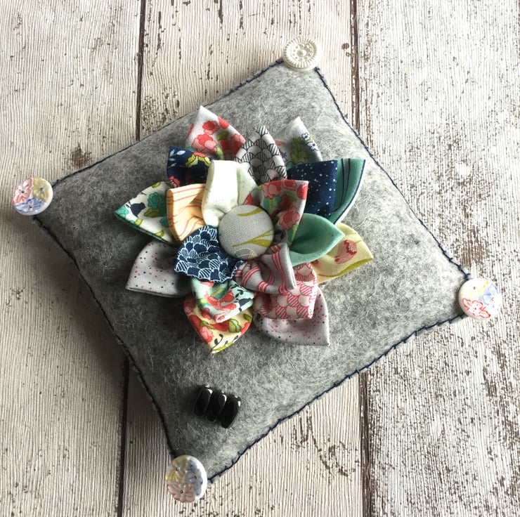 The grey wool felt cushion has a flower of 20 fabric petals in shades of turquoise, navy, white, pink and red with a self covered button middle. Each handmade petal will hold a quilting clip.