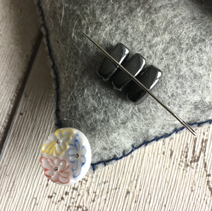 Three black, magnetic beads sewn in one corner will hold a needle and the rest of the cushion can be used for pins. If placed at an angle they will not pierce the bottom and mark your surface underneath.