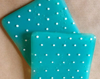 This coaster is 10x0cm, Coloured background with white spots all drawn on by hand.