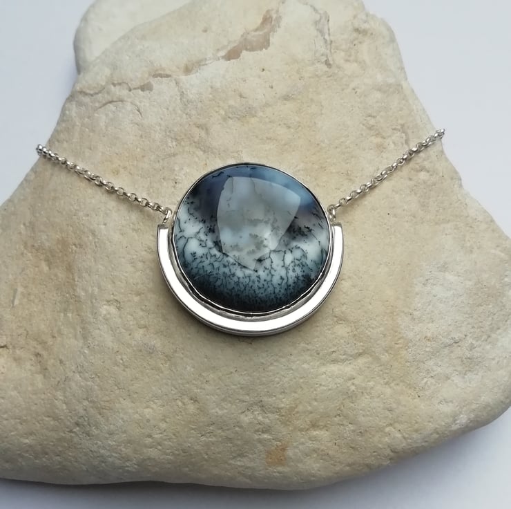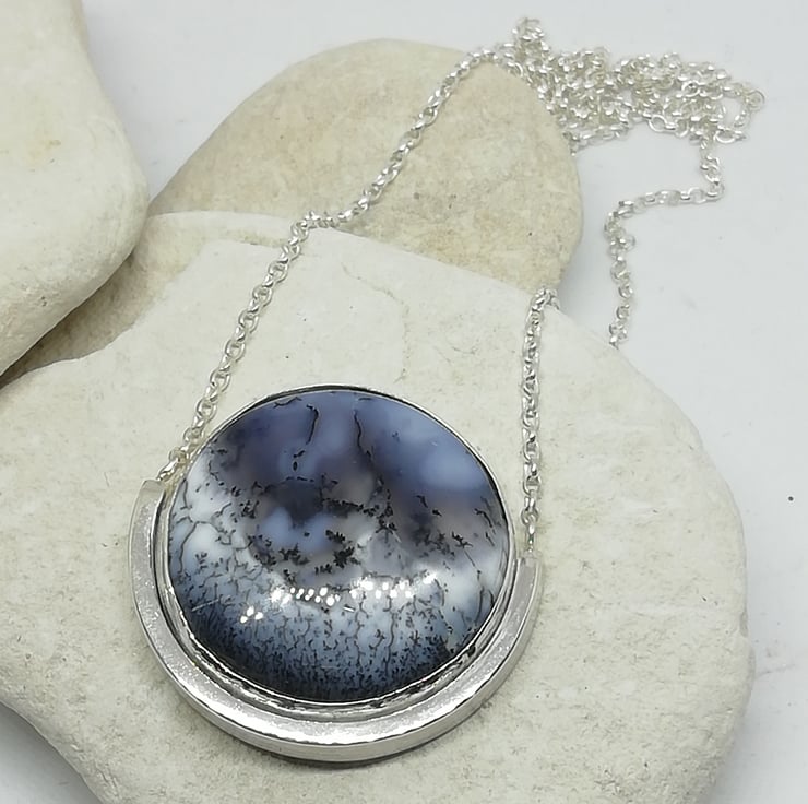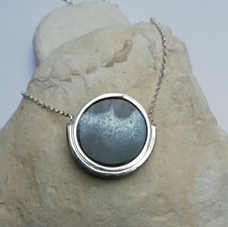 This 30mm dendritic opal cabochon has an amazing swirly pattern of white and greys. It reminds me of a stormy watercolour sky. The stone has been set in a semi circle of solid silver which is suspended on a silver belcher chain. The back of the stone is also visible if you prefer that side.