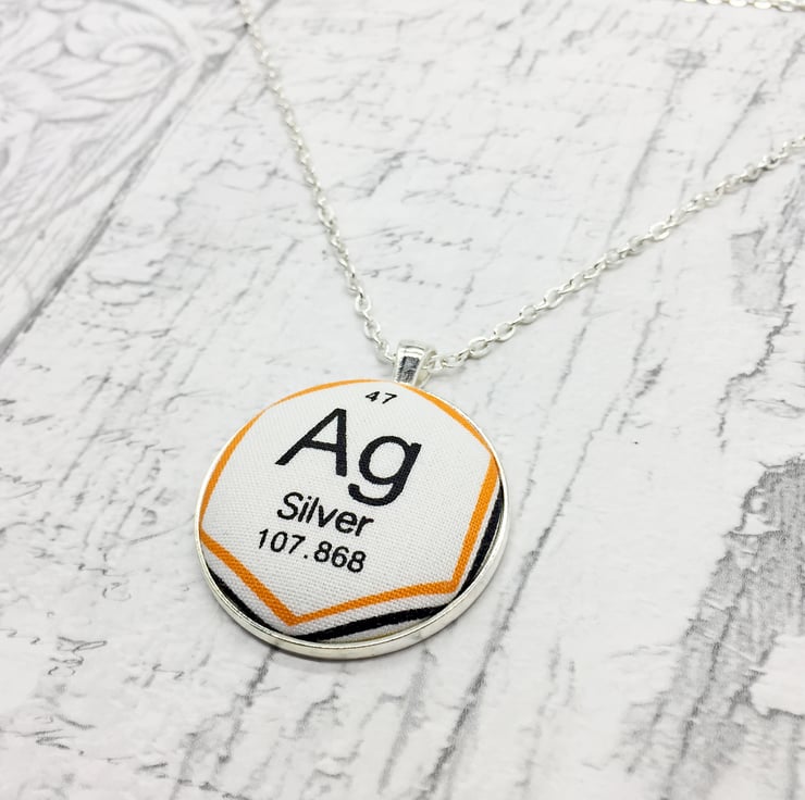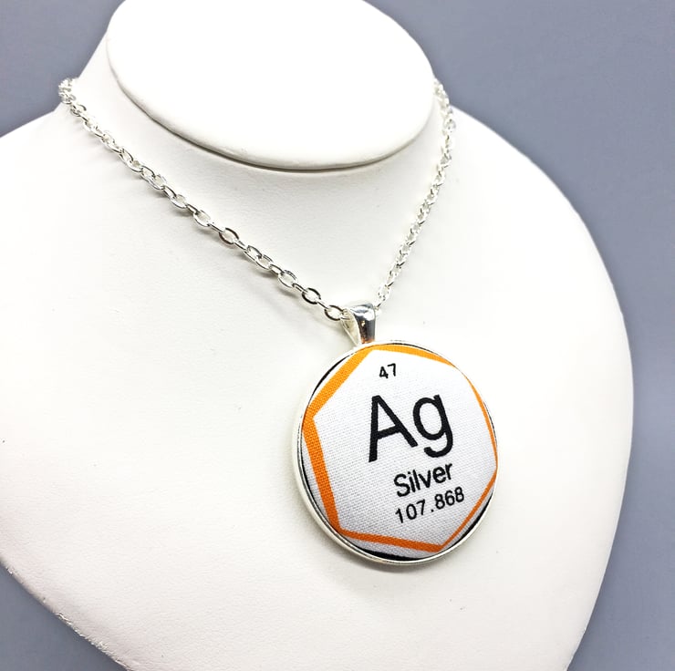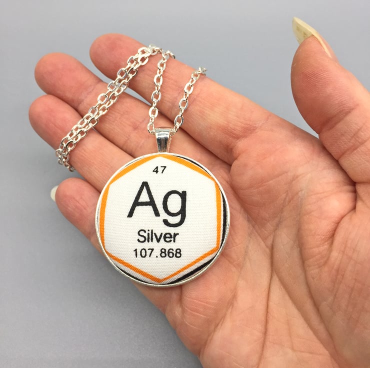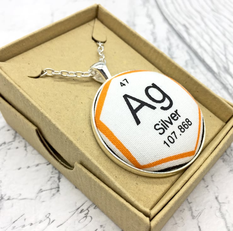 Here is a little fun bit of jewellery from me - a 'silver' pendant! One for all the science geeks out there, this pendant is created from 100% cotton printed fabric featuring elements from the periodic table - in this particular instance it is for Silver.