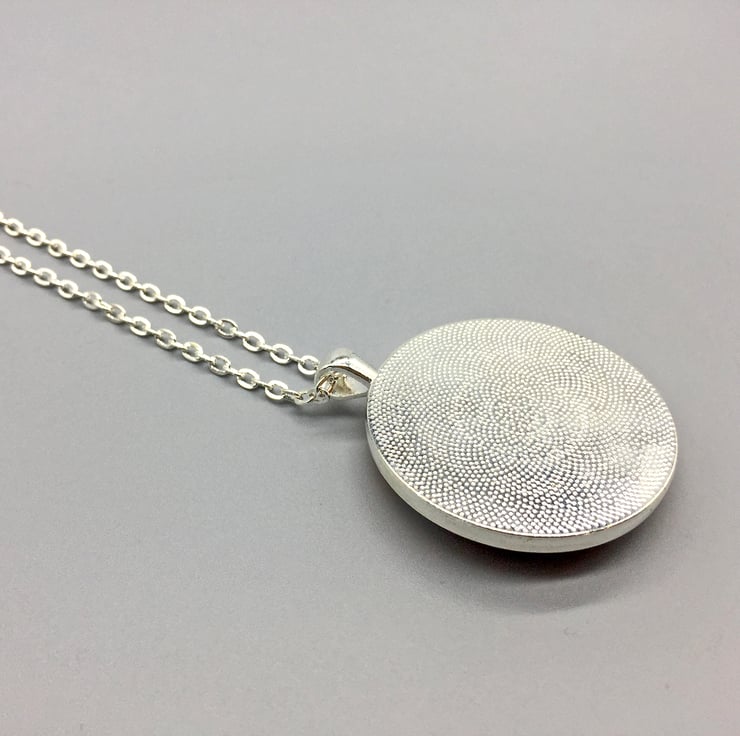 I've created a handmade flat backed button using this beautiful fabric and aluminium button blanks. Then, I selected a silver plated round pendant blank for the button to sit inside it and secured with jeweller’s grade glue.