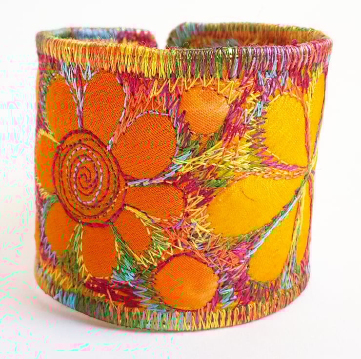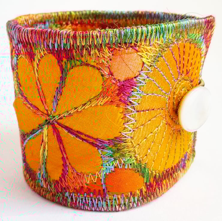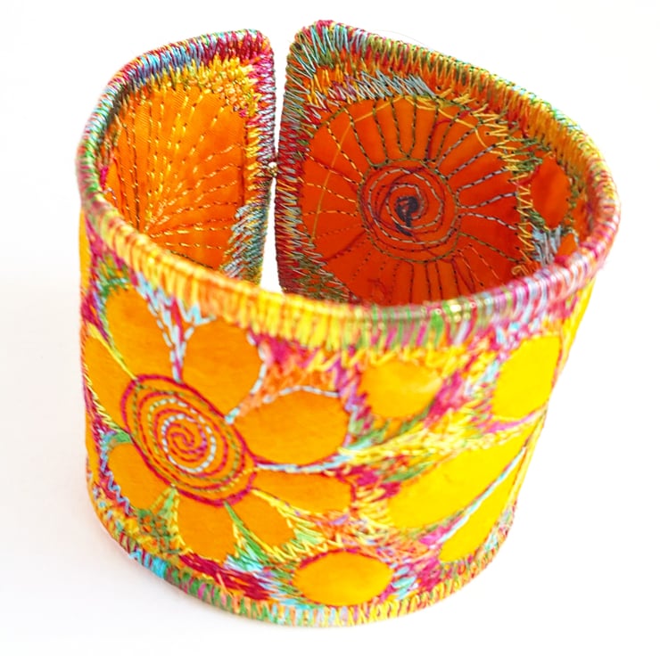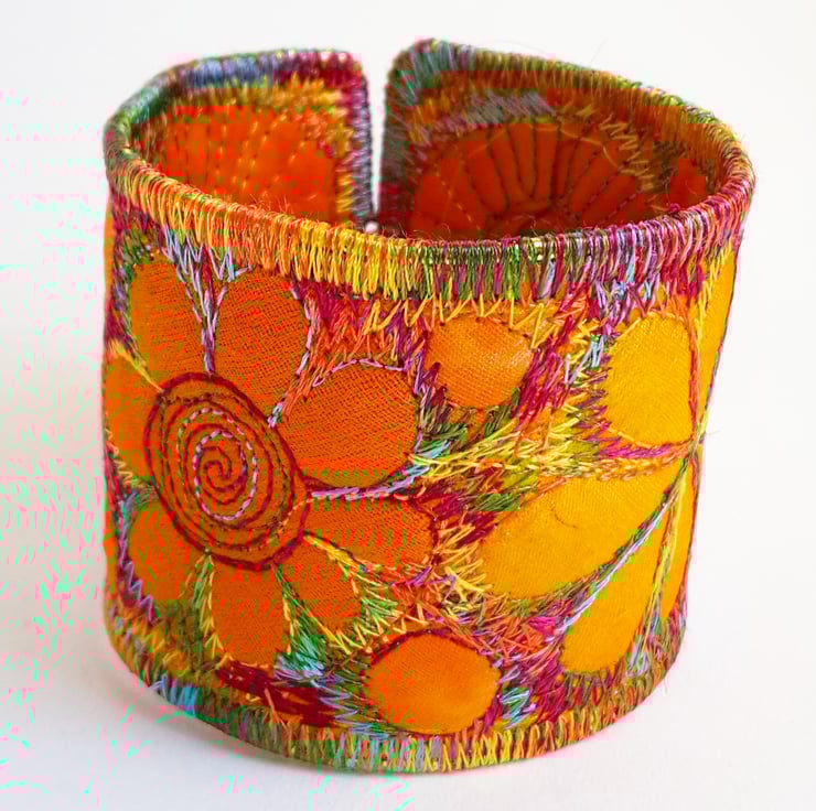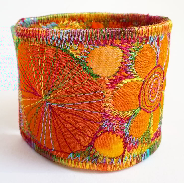Made from layers of fabric including hand dyed Egyptian cotton and silk fabrics using the free machine embroidery style of sewing
