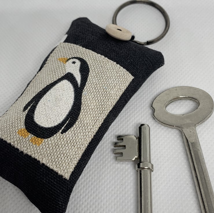 In black and white polka dot printed cotton with a charming penguin patch, your keys will be super easy to spot in the key pot, cupboard or drawer, the bottom of your handbag or wherever else you've left them. Also looks good on a cupboard or wardrobe key in its lock. And makes a thoughtful and original housewarming present or a fantastic bag charm.