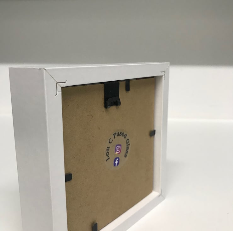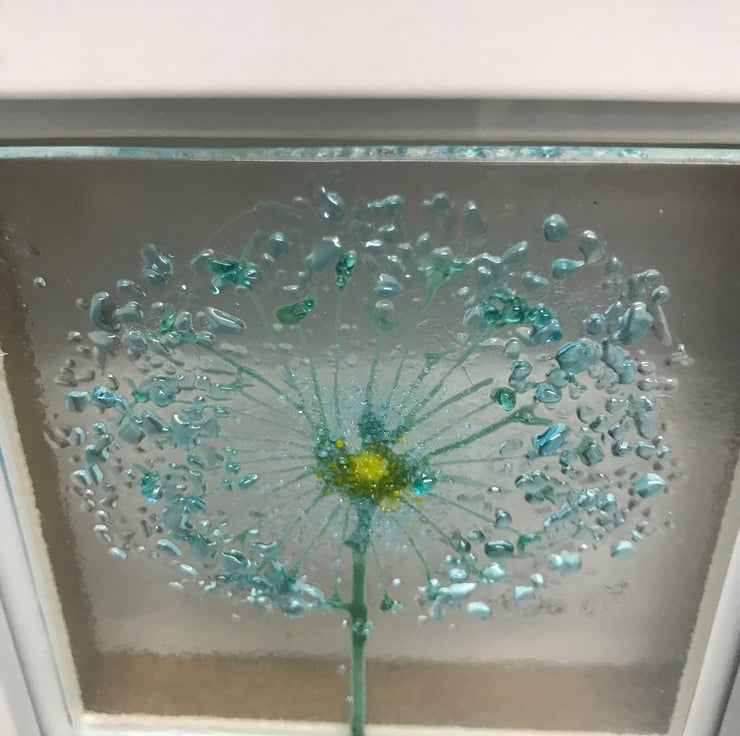 Hand grafted from glass powder dandelion heads mini box frame picture . 10cm square . Lovely addition to a home and easy to hang . Frames may vary but always white with same dandelion design