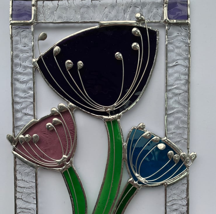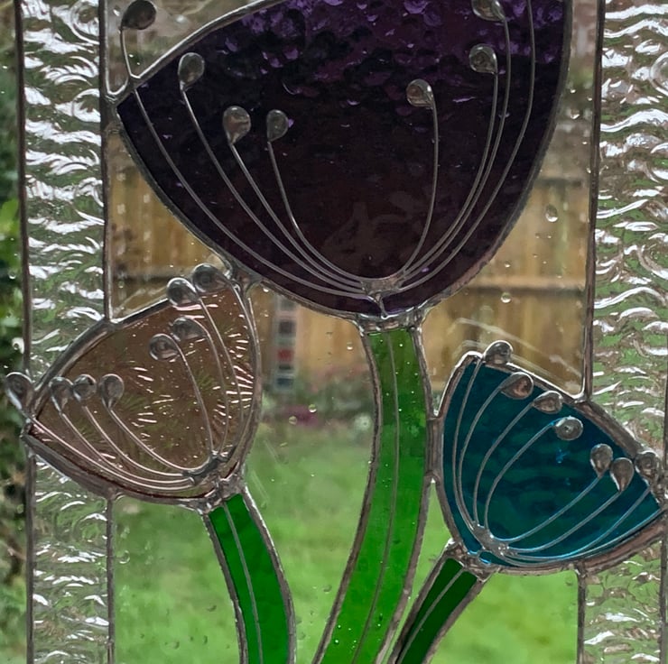 Each piece of glass has been hand cut, ground and foiled before being soldered together. The seed heads have been made from twisted, tinned wire.
