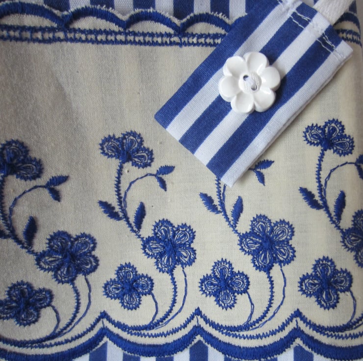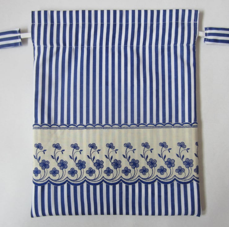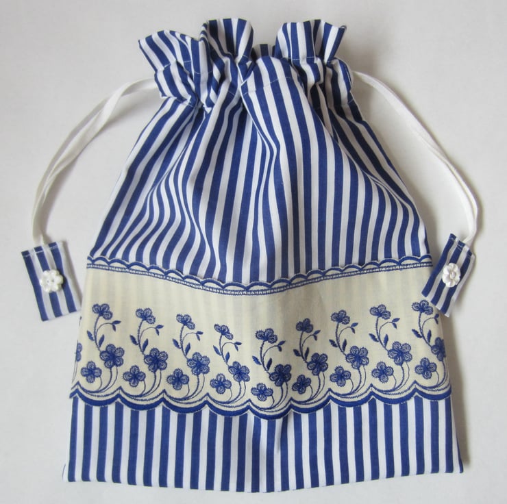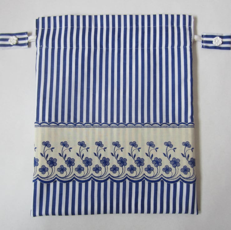 Drawstring shower bag made with blue and white striped fabric and decorated with a vintage flower design trim back and front. It is lined with a strong shower proof lining. Pulls closed with matching tapes and tabs. Each tab is decorated with a white vintage flower button.
