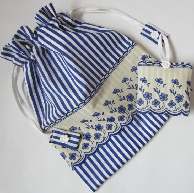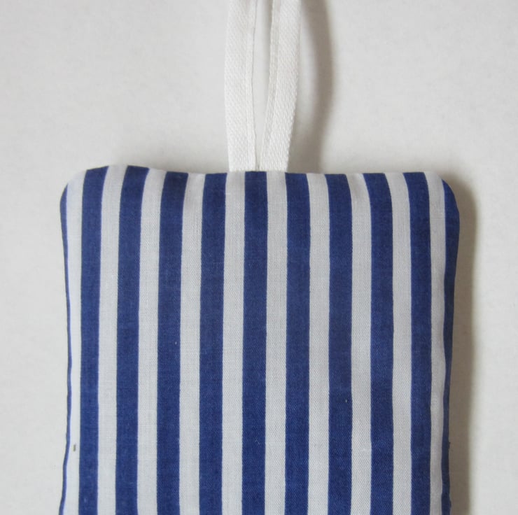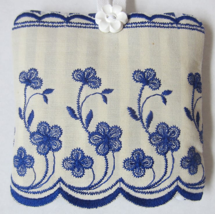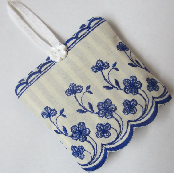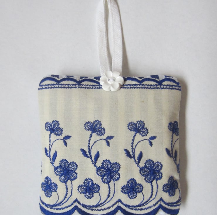 Lavender sachet made from blue and white striped fabric and decorated with an embroidered vintage flower design trim and white vintage button. It hangs with a matching fabric loop.