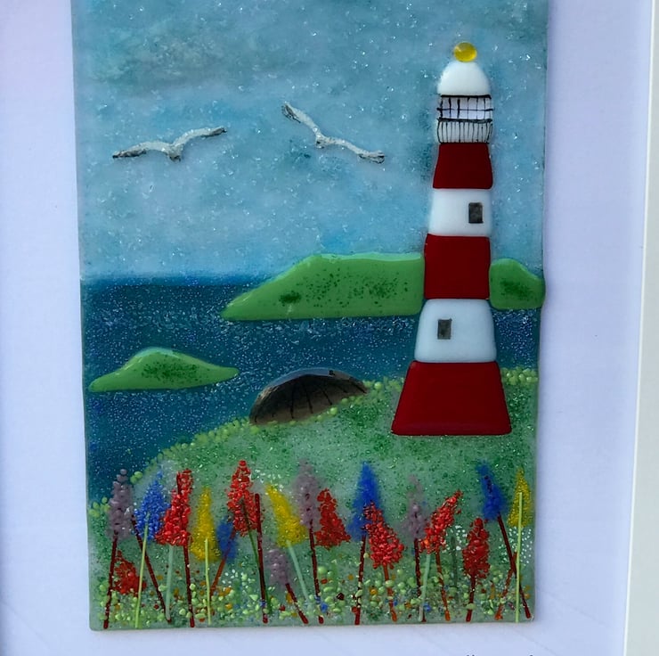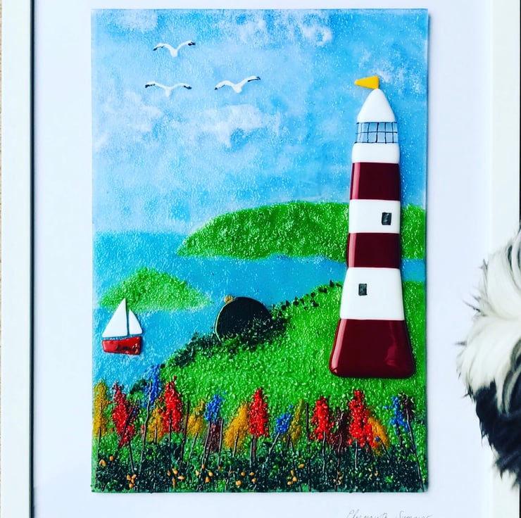 Fused glass depiction of Plymouth hoe on a lovely summers day . The fused glass picture is built up in stages and goes through many separate firings in my kiln . I’m based in Plymouth Devon so this is a particularly special place to me . The smeatons tower is the most iconic landmark in Plymouth and is loved worldwide . The glass picture is a4 size with a 2inch bordered frame around . Each is unique and made to order . Please contact me to discuss your preferences.