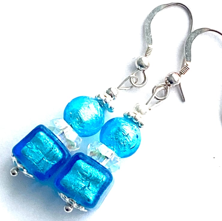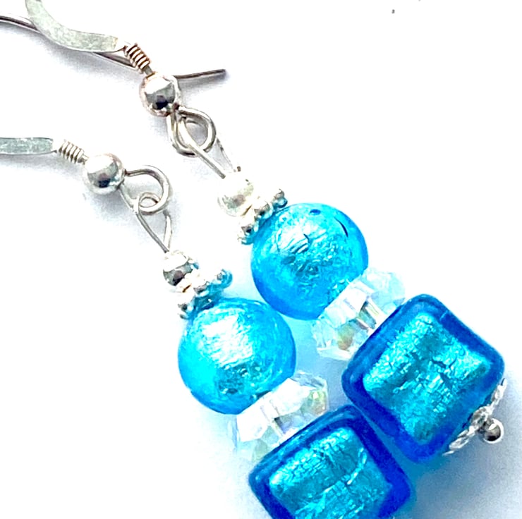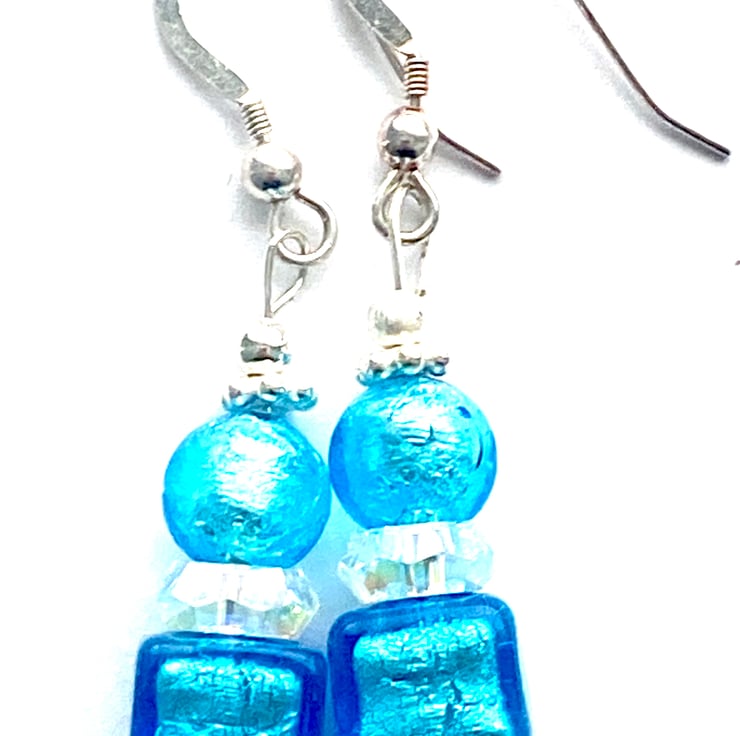 Murano Glass earrings with pure silver foiled turquoise blue Murano Glass cube beads and sparkly Swarovski crystal beads and sterling silver daisy spacer beads. The beads are a wonderful rich colour enhanced by silver findings. The earrings hang from sterling silver ear wires and measure 30mm in length excluding ear wires and are presented in a velvet pouch.