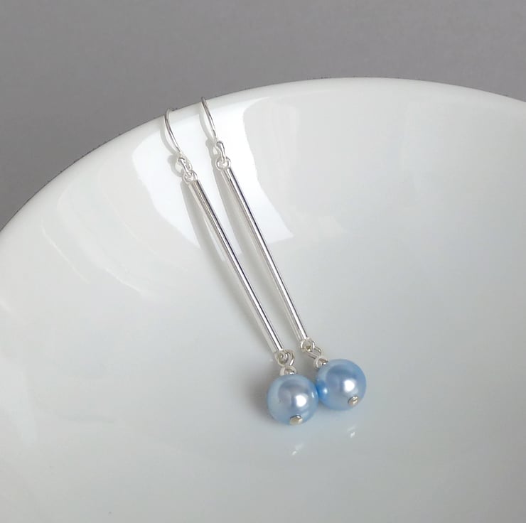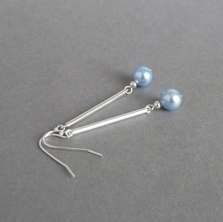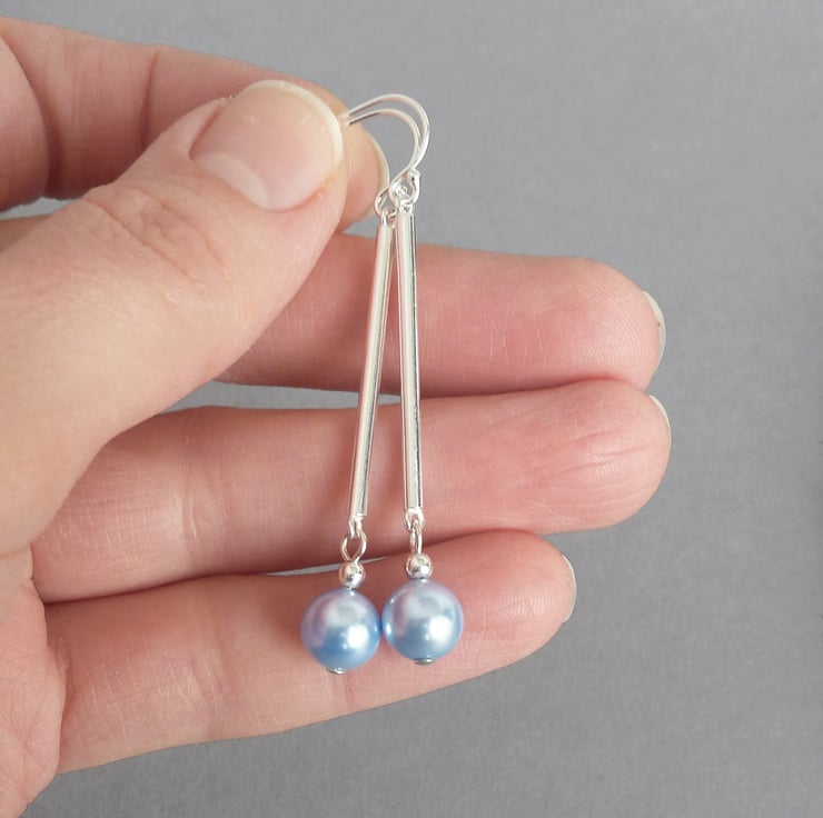 8mm light blue glass pearls drop from Sterling silver bars to create these powder blue dangle earrings. Classic in design, these long dangle earrings make great gifts and are great for finishing off an outfit.