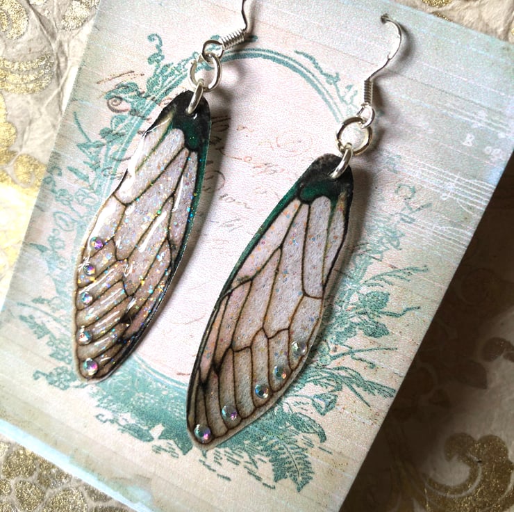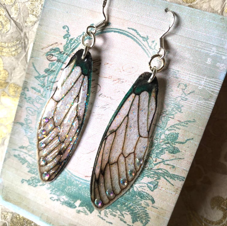 Iridescent glitter beneath the surface of the wing brings a beautiful subtle sparkle to the earrings.