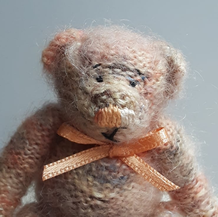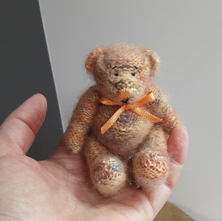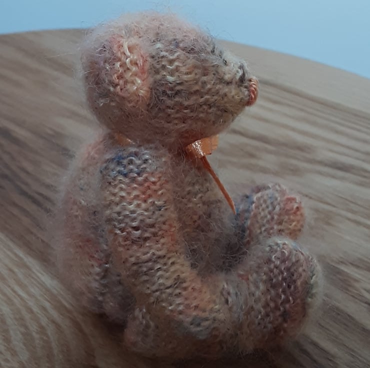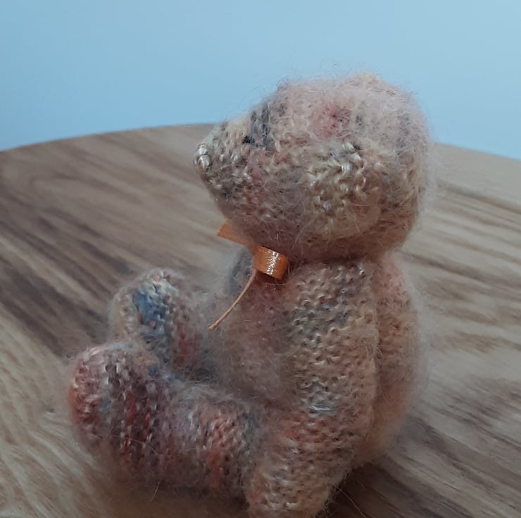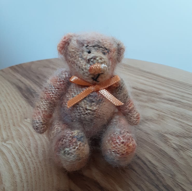 This little bear is hand knitted in shades of cream, browns, oranges from 100% hand dyed mohair and very fluffy. His nose is hand embroidered with perle verigated thread and face is hand embroidered with black perle thread. Stuffed with hi loft polyester filling.