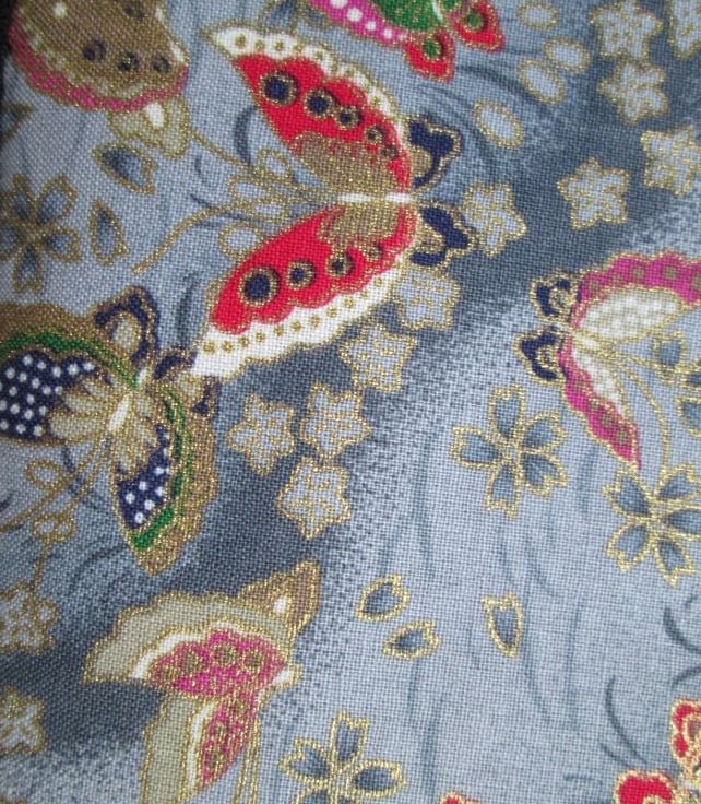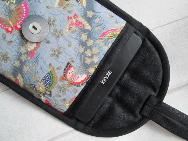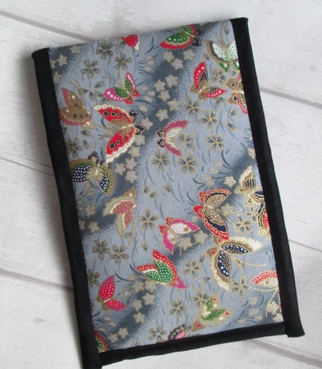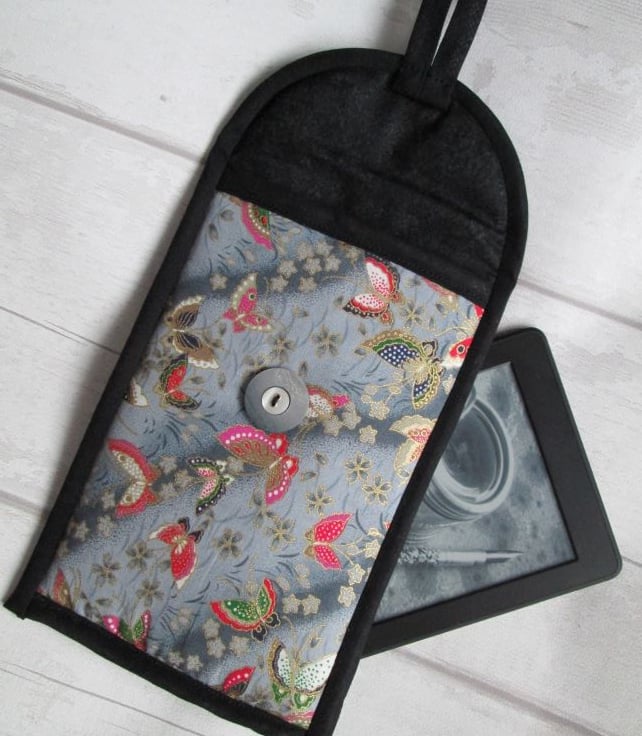 A Kindle/E reader/small tablet case in an elegant oriental print of butterflies on a shaded grey background with metallic gold highlights. I've lined it with marbled black cotton and finished it with black bias binding and a layered button fastening. The case is lightly wadded for protection, with an additional layer of interfacing inside the lining for structure.