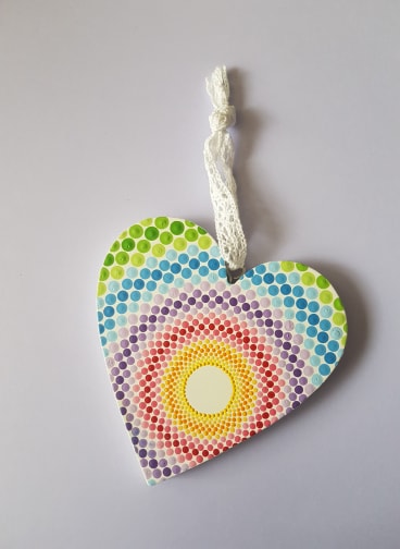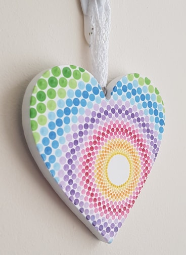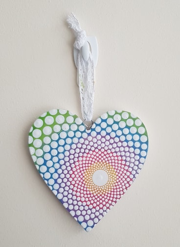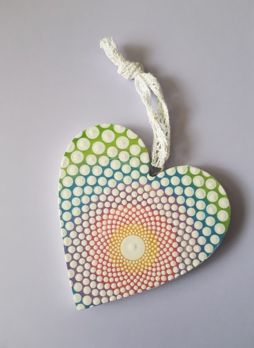 The heart is double sided, with a different design on each side. Both sides are hand painted in dot art.