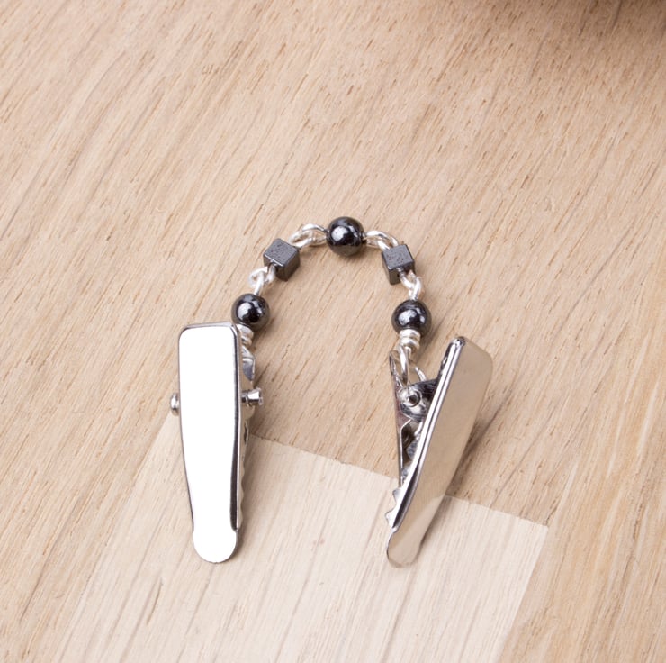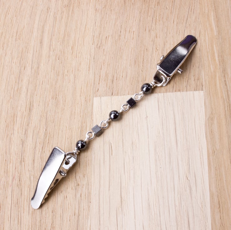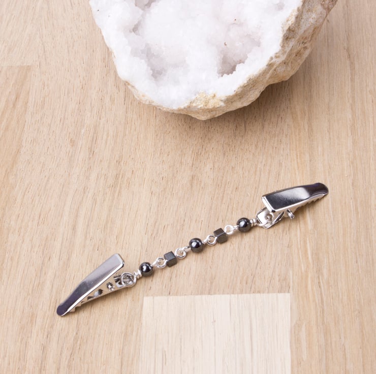 This handy clothing clip features hematite stone cube and round beads which sit between silver-tone clips and is approximately 3.5 inches long (inc clips )
